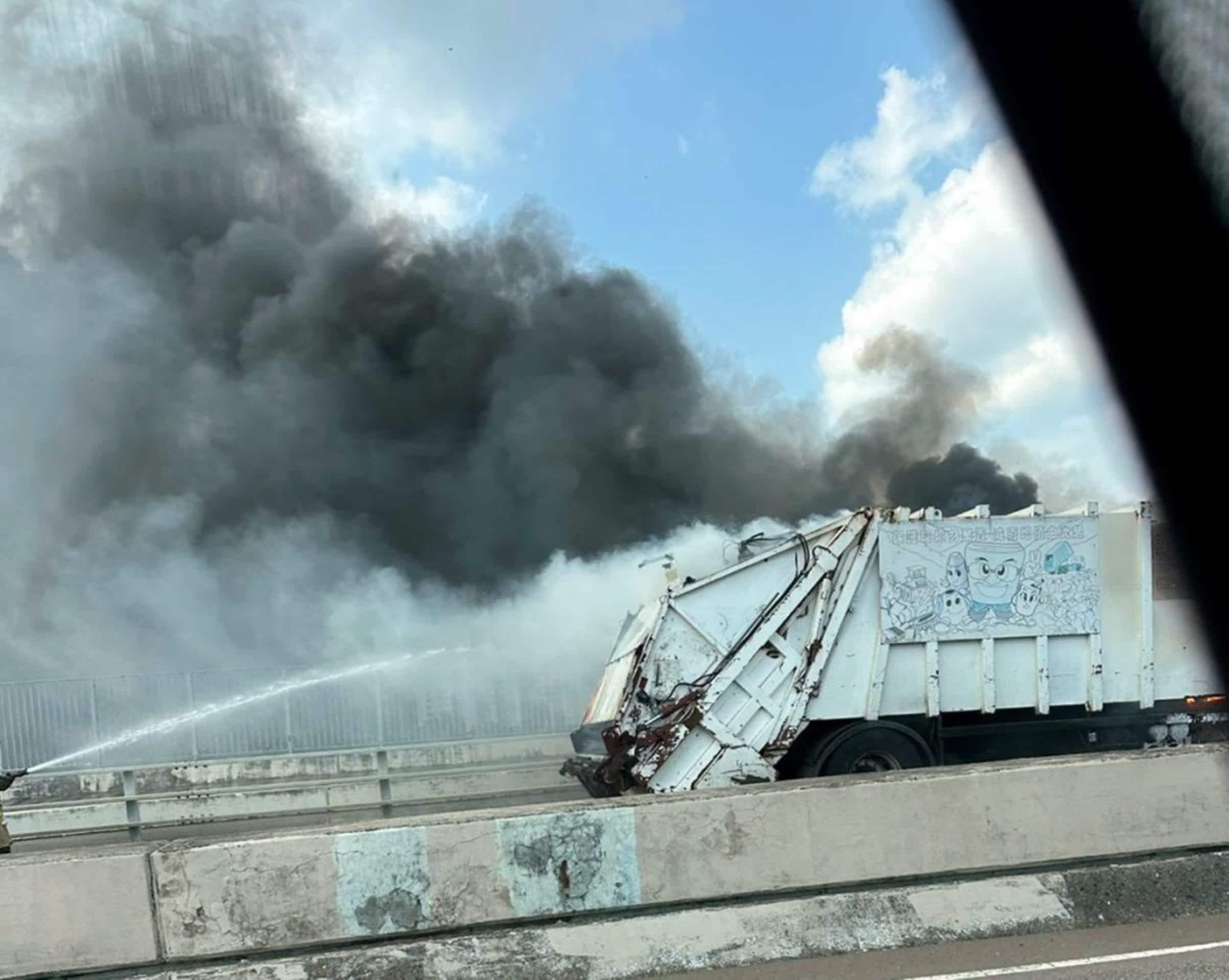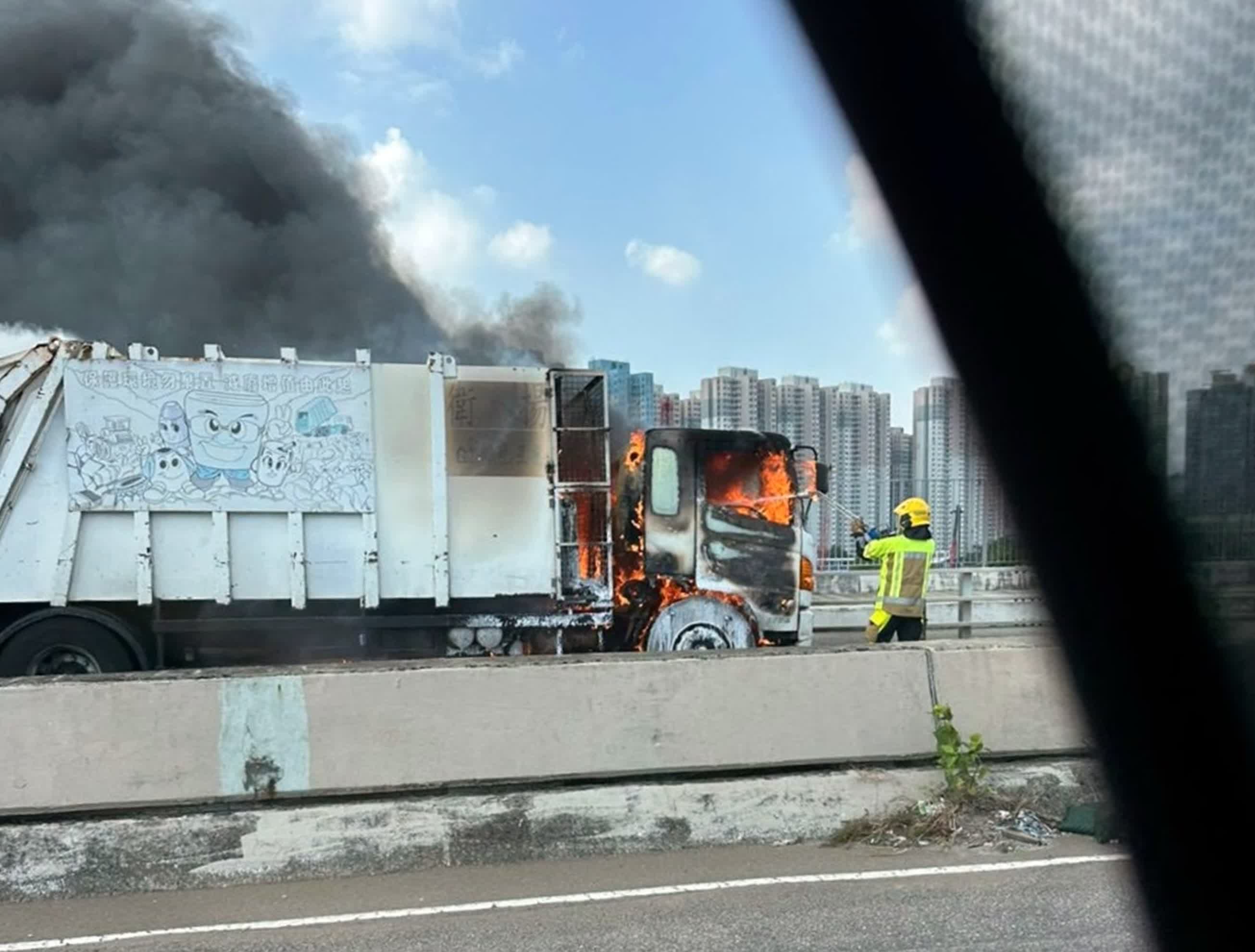 香港文匯報訊(記者 蕭景源)今日(9日)下午2時16分,一輛重型垃圾車駛經屯門海皇路時車頭突然冒煙起火,司機和一名跟車工人見狀,立即將車停在路邊棄車逃生及報警。惟在消防員到場前,火勢已迅速蔓延吞噬整個駕駛室,大量濃煙捲上半空,遠處亦可看到。