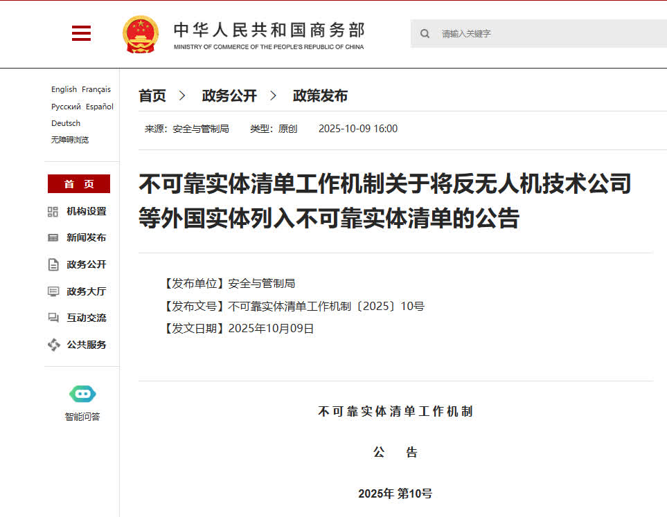 今天,商務部發布將反無人機技術公司等外國實體列入不可靠實體清單的公告,全文如下: