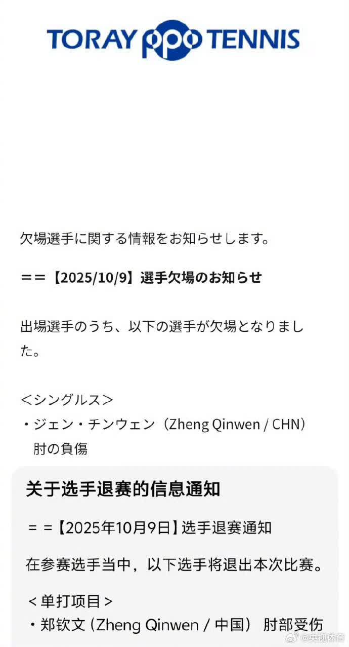 據官方消息,賽事衛冕冠軍鄭欽文因肘部受傷退出WTA500東京站。此前,鄭欽文已經因傷退出了武漢賽和寧波賽。