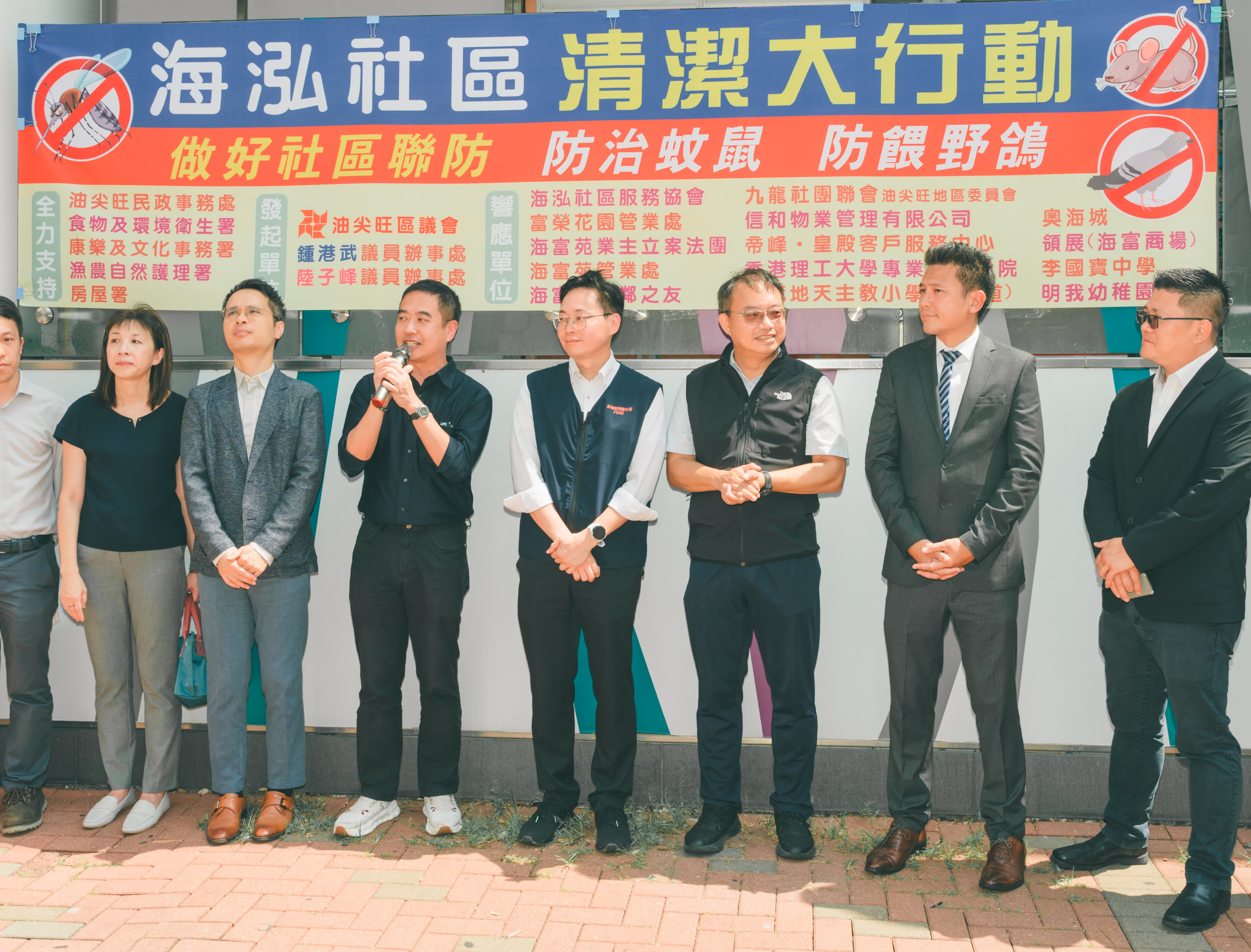 食環署旺角區總監莊宏偉認同防治蚊鼠防餵野鴿的社區聯防概念,並同時向市民傳達防治蚊鼠的訊息,以及藉此機會介紹《2025公眾衞生及市政(修訂)條例》於8月17日生效後,食環署可就屋苑或大廈公用部分的蚊鼠滋生問題向大廈管理負責人,例如物管公司,送達「消除蟲鼠通知」,並已提高違反通知的罰則。另外,在雜物霸佔公眾地方以致妨礙垃圾清掃工作上,把「移走障礙物通知書」所指明的移走物品期限由過去的最少四小時縮短至不少於30分鐘,食環署可因應實際情況,酌情指明較長而合理的期限。食環署會繼續加強在海泓社區的防治蚊鼠工作,在有需要時會主動聯繫地區不同持份者(如屋苑及商場管業處、學校及議員辦事處等),在防治蚊鼠措施上提供改善建議。