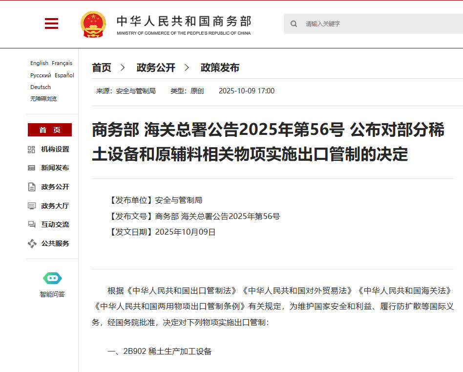 今天,商務部、海關總署發布公告,公布對部分稀土設備和原輔料相關物項實施出口管制的決定,內容如下:
