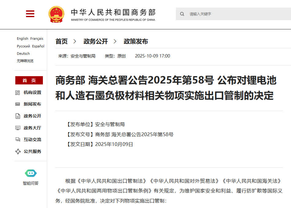 今天,商務部、海關總署發布公告,公布對鋰電池和人造石墨負極材料相關物項實施出口管制的決定,內容如下: