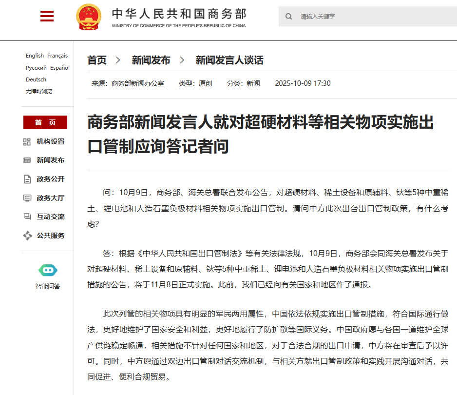 答:根據《中華人民共和國出口管制法》等有關法律法規,10月9日,商務部會同海關總署發布關於對超硬材料、稀土設備和原輔料、鈥等5種中重稀土、鋰電池和人造石墨負極材料相關物項實施出口管制措施的公告,將於11月8日正式實施。此前,我們已經向有關國家和地區作了通報。