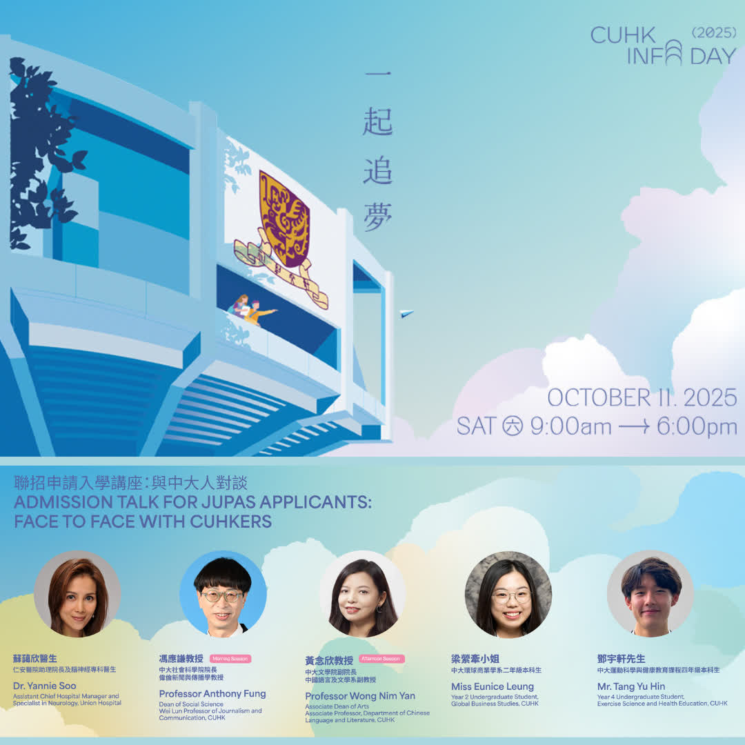 有關中大本科入學資訊日的精彩活動,可瀏覽中大網上小冊子及網站,或下載中大流動應用程式「CUHK Mobile」。