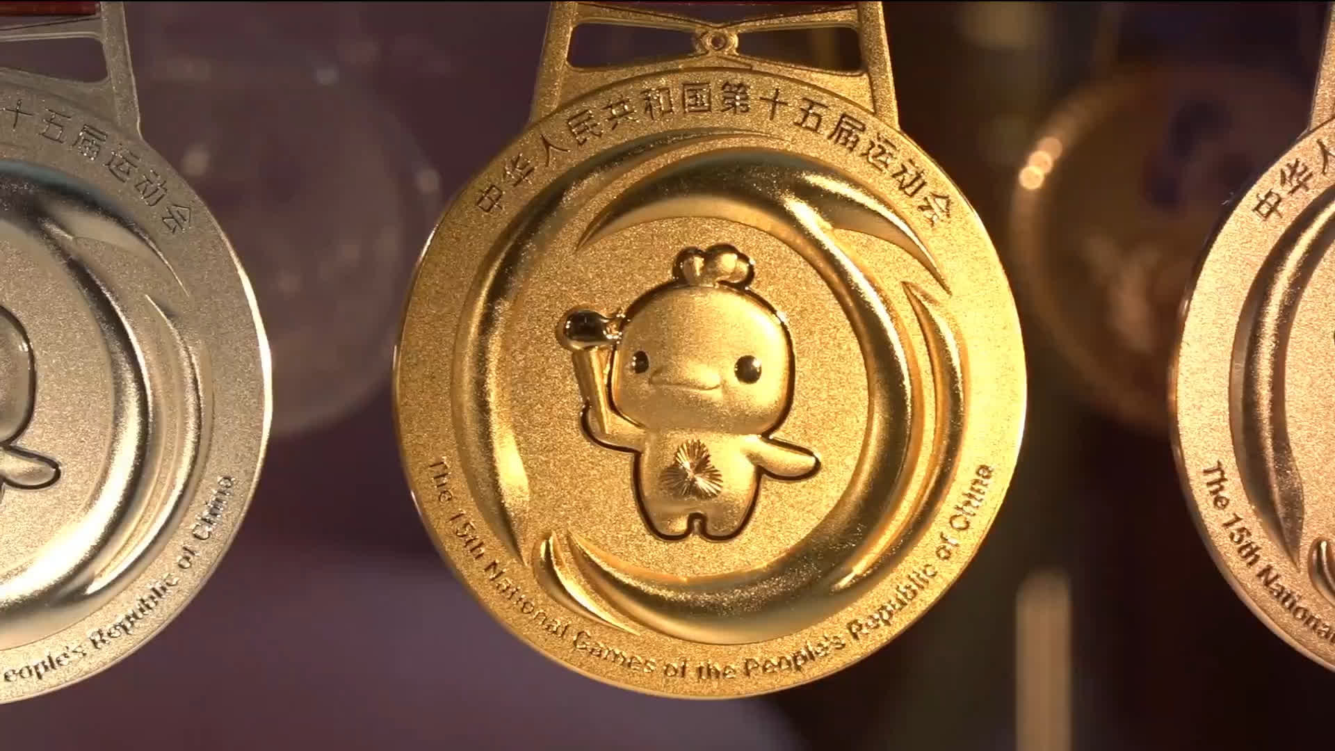 獎牌背面正中為十五運會吉祥物中華白海豚「喜洋洋」高擎火炬,傳遞奧林匹克精神生生不息、代代相傳的信念。