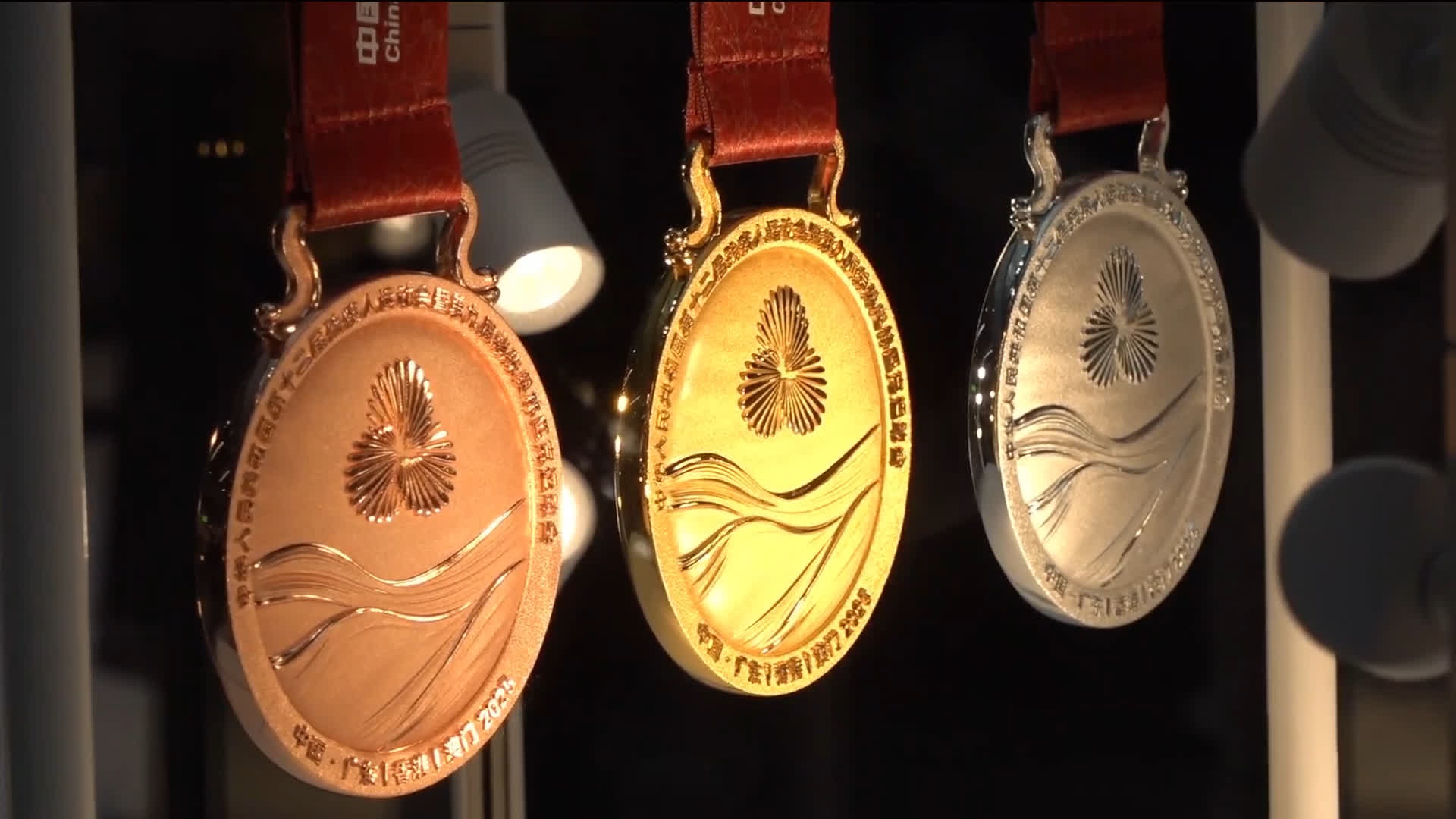 在細節方面,獎牌掛扣採用了港珠澳大橋的同心結造型,寓意三地同心、緊密團結、共同發展。獎牌邊緣特意設計了66道紋路,代表全國運動會已走過了66年歷程。獎牌綬帶以「三花映牡丹」為紋樣,左右對稱印有會徽、運動會舉辦地和時間。