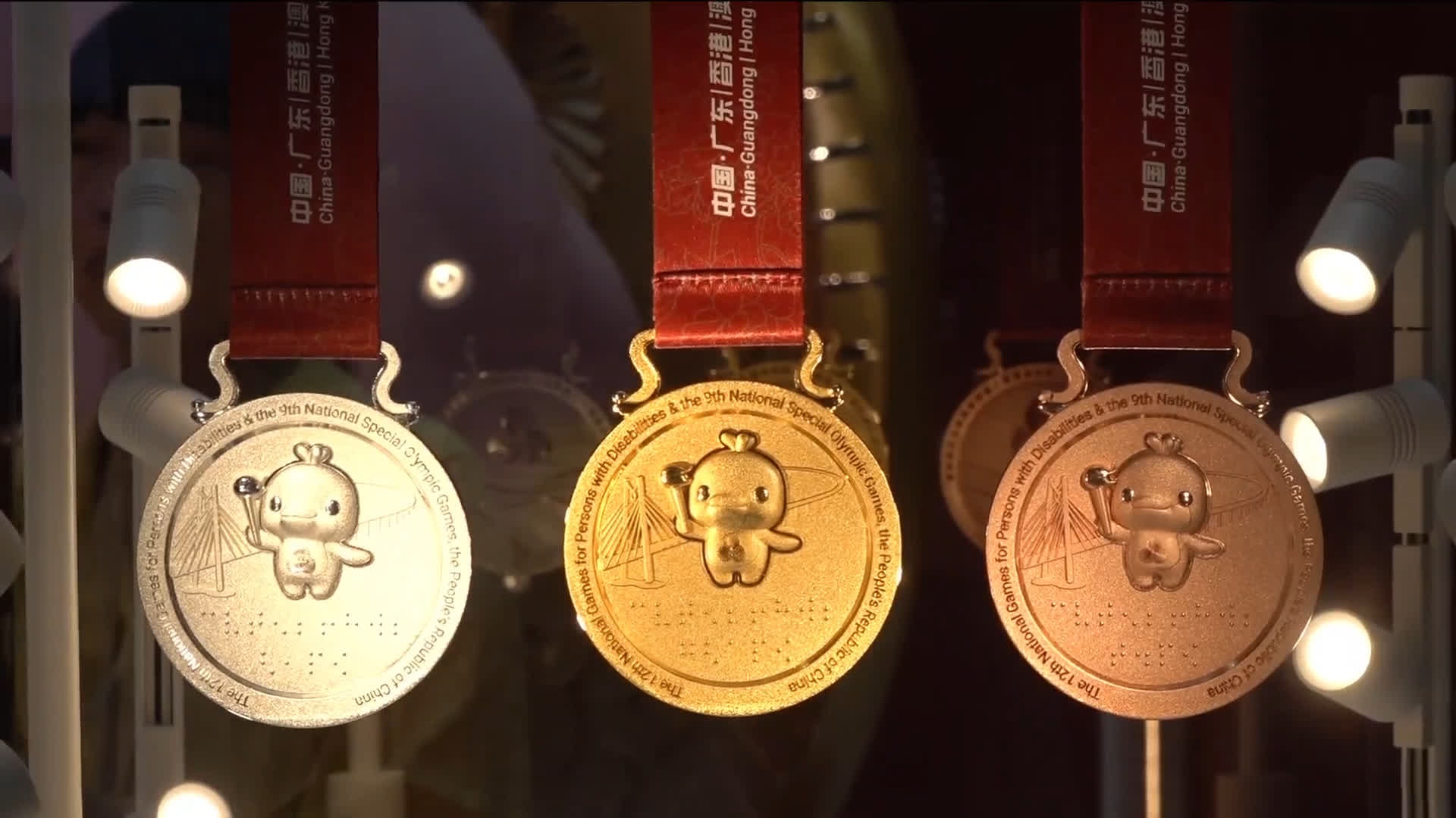 更引人注目的是,浮雕下方創新嵌入盲文,第一行鐫刻「殘特奧會」,第二行分別對應獎牌標註「金牌」「銀牌」「銅牌」,讓視障運動員可通過觸摸感知榮譽,彰顯賽事對特殊群體的細緻關懷。背景中的港珠澳大橋是圓夢橋、同心橋、復興橋,體現逢山開路、遇水架橋的奮鬥精神。