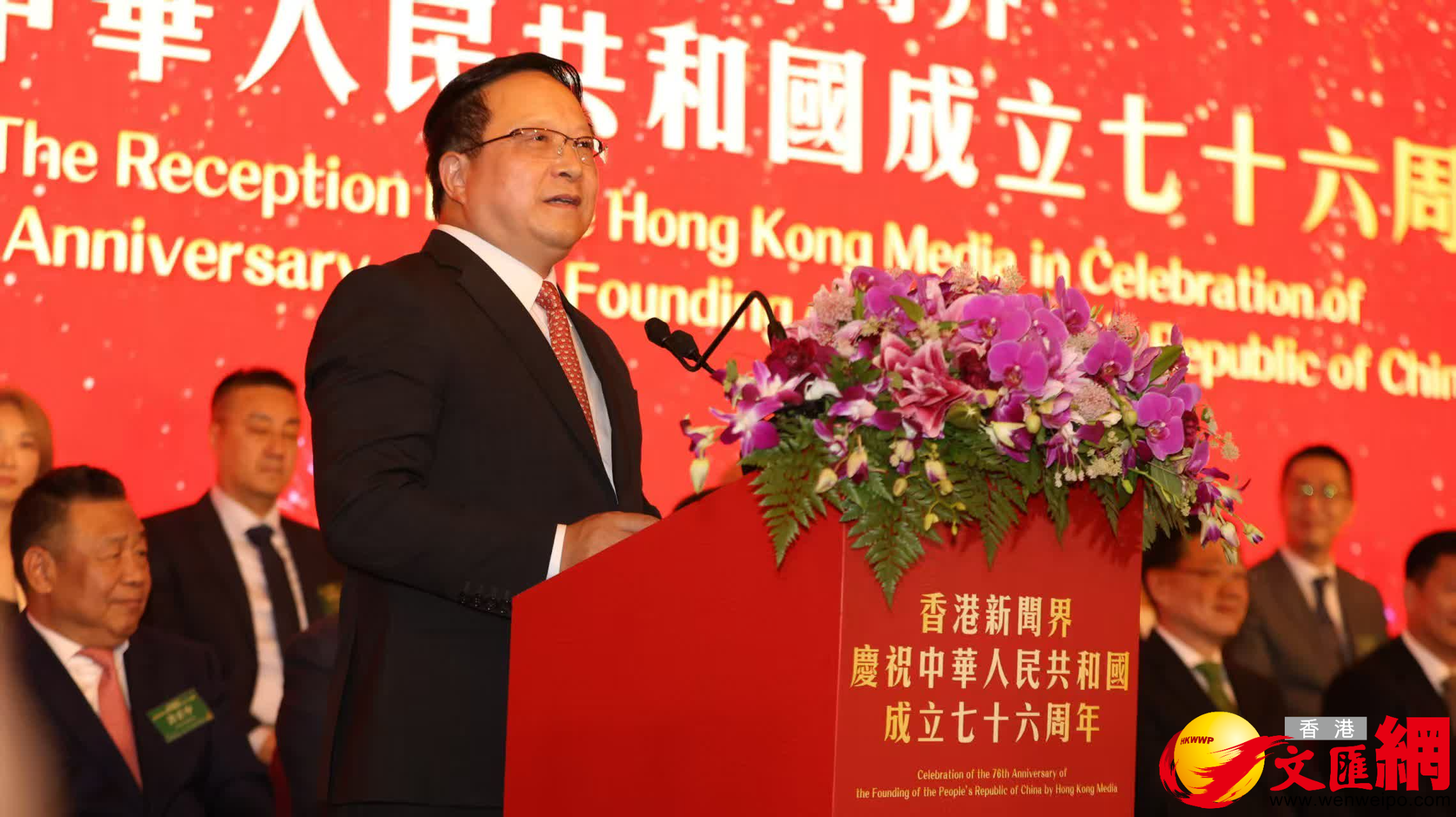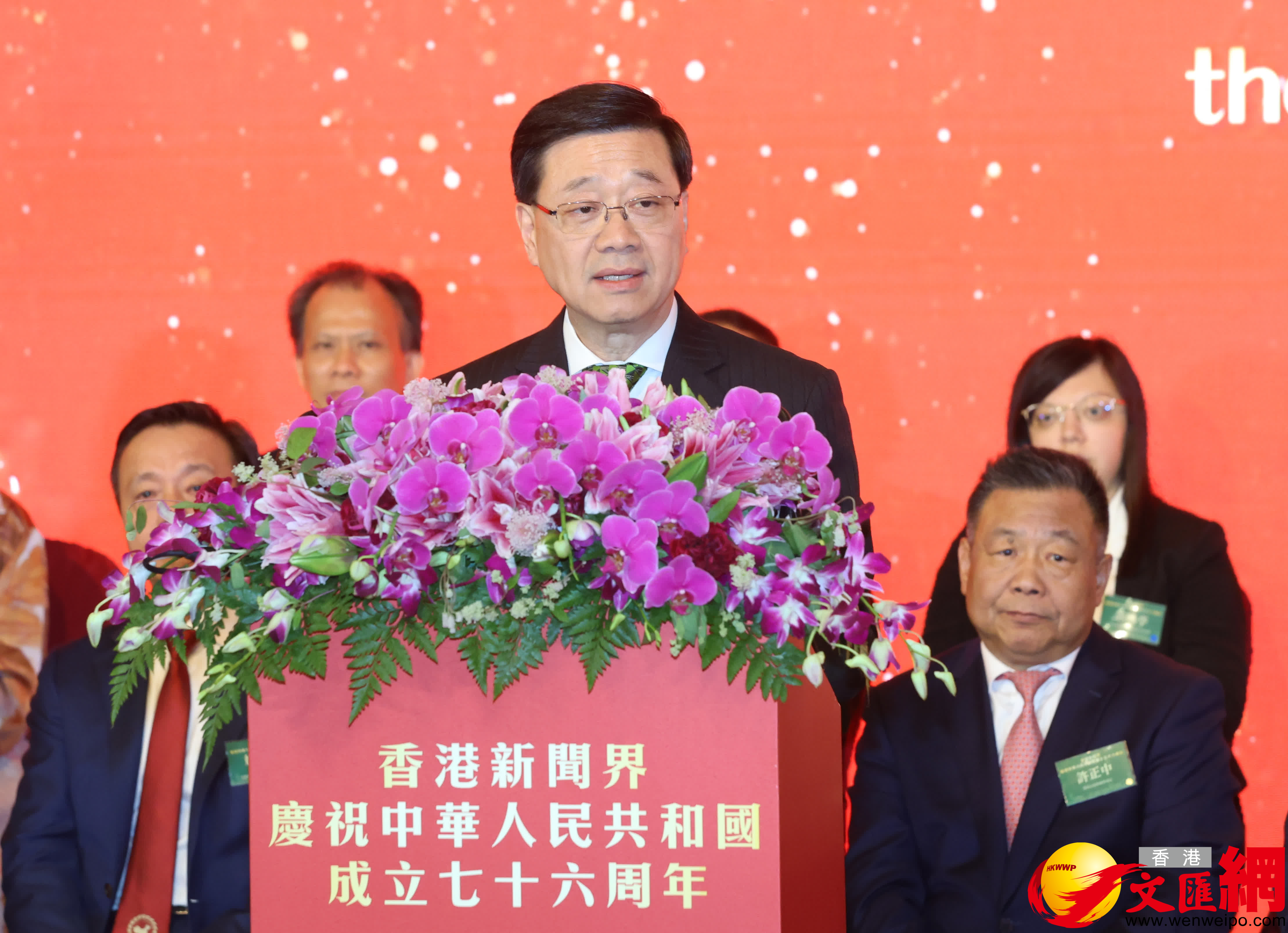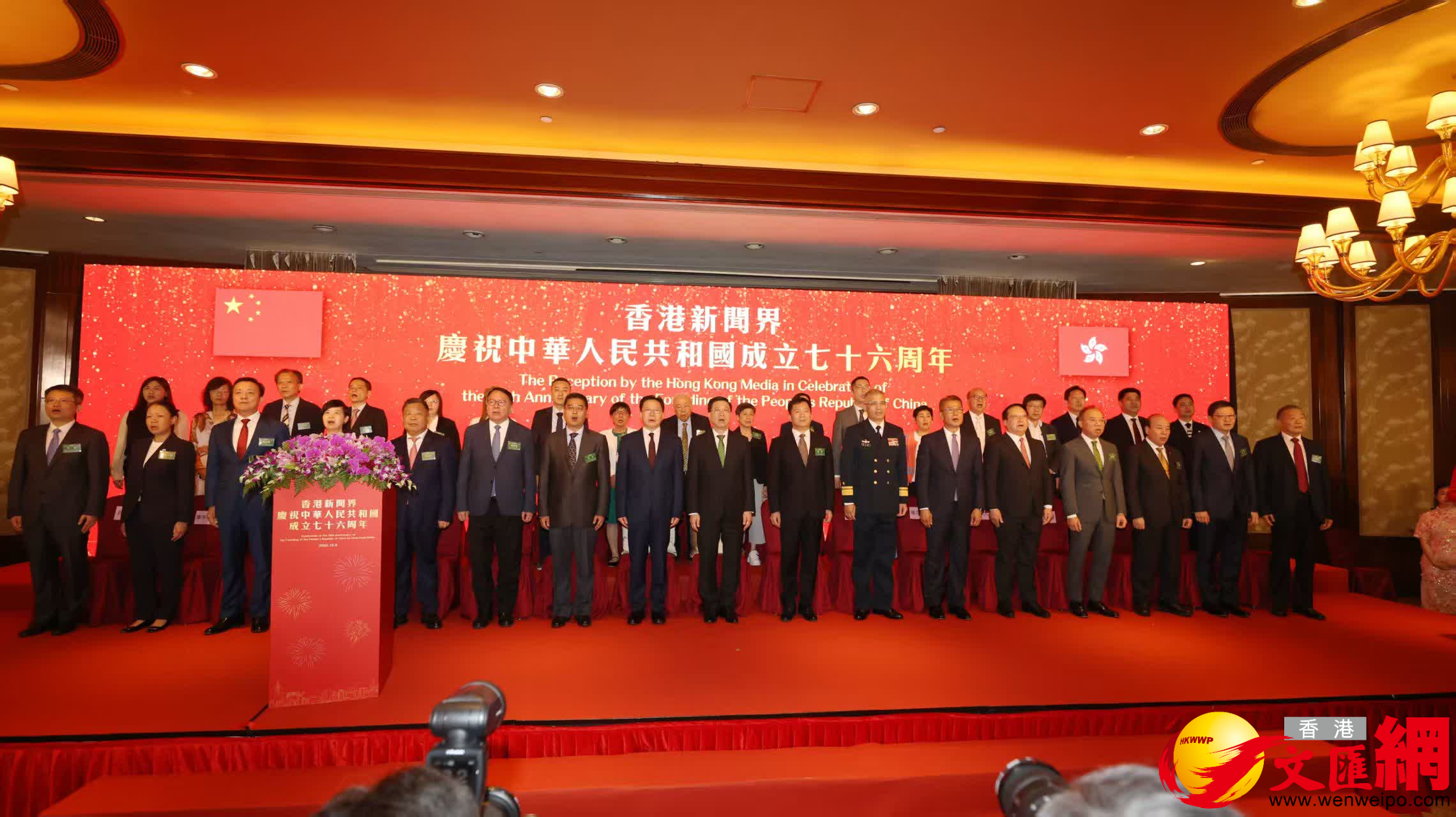 (香港文匯報記者 嚴鍇華)香港新聞界慶祝中華人民共和國成立76周年活動今日(9日)隆重舉行。香港特區行政長官李家超,中央政府駐港聯絡辦主任周霽,外交部駐港副特派員花有,中央駐港維護國安公署副署長陳楓,解放軍駐港部隊副司令員譚志偉,以及特區政府政務司司長陳國基,財政司司長陳茂波,紫荊文化集團董事長許正中,香港新聞界國慶籌委會主任委員、香港新聞工作者聯會主席、香港大公文匯傳媒集團董事長李大宏等出席主禮。近500位社會各界賢達與新聞界同仁齊聚一堂,共同祝願祖國繁榮昌盛,香港社會持續穩定發展。