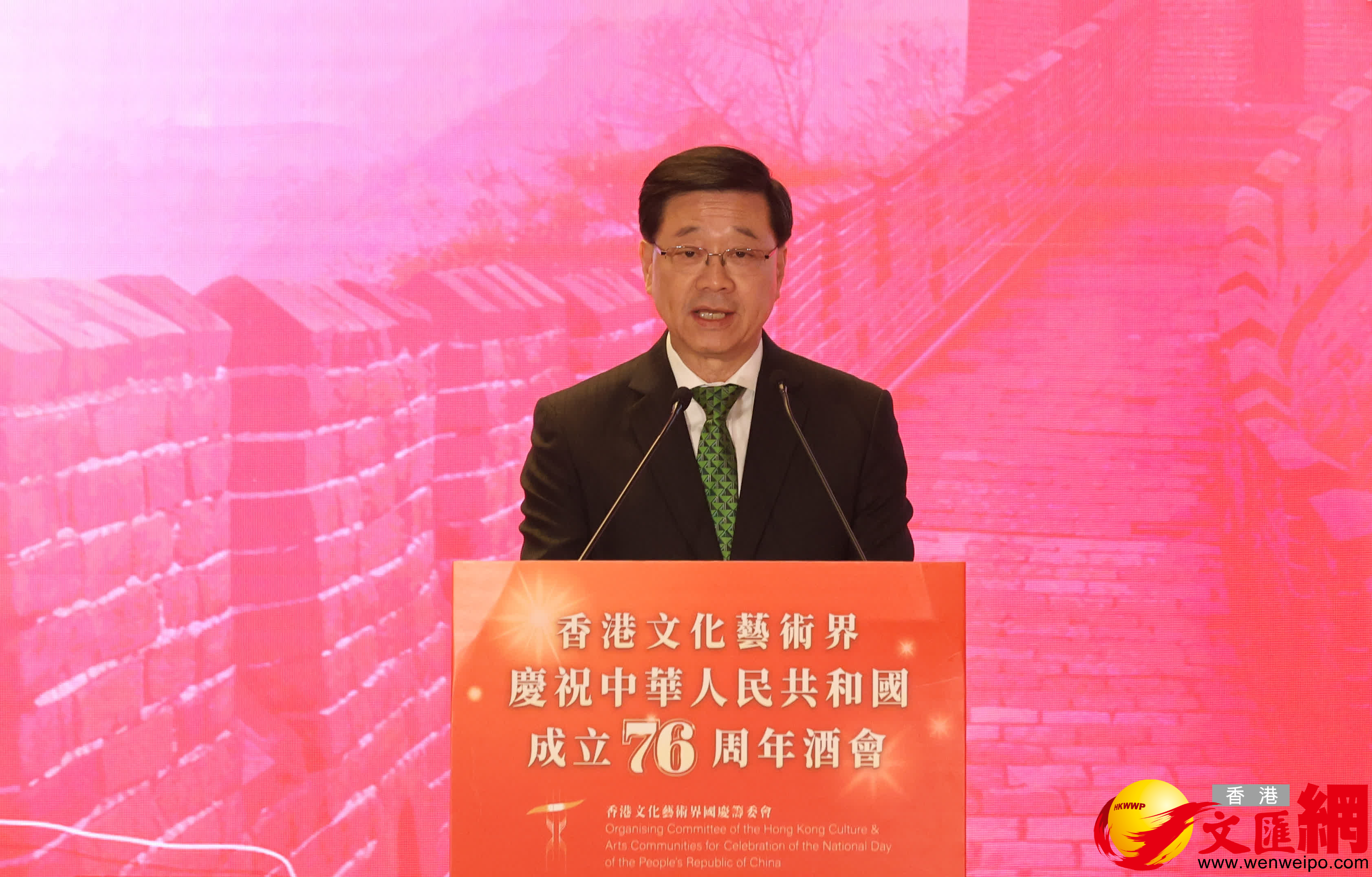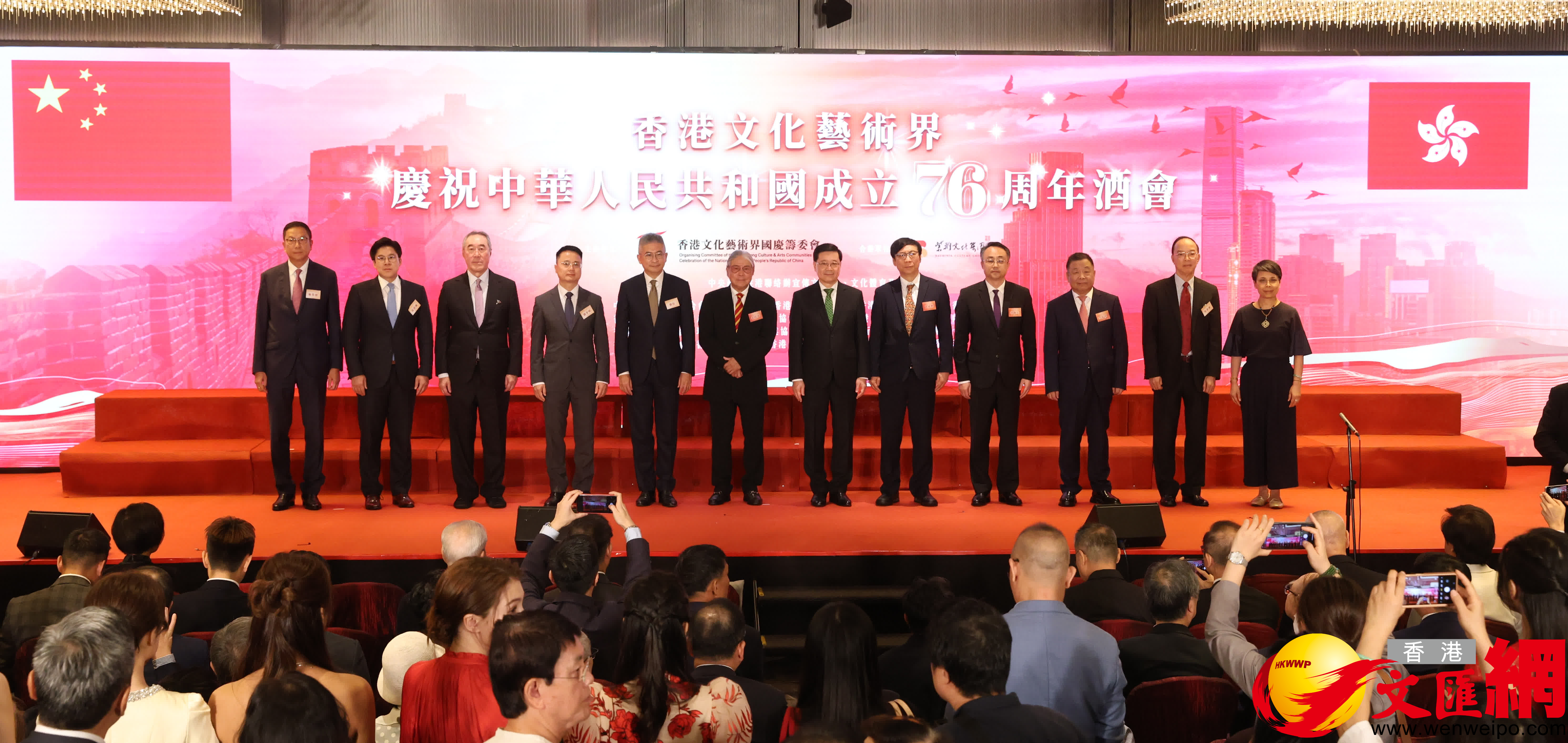 (香港文匯報記者 嚴鍇華)由香港文化藝術界國慶籌委會舉辦的香港文化藝術界慶祝中華人民共和國成立76周年酒會今日在港舉行,一眾本地文化藝術界精英及業界友好聚首一堂,同賀國慶,並共同紀念抗戰勝利80周年。香港特區行政長官李家超致辭表示,在國家「十四五」規劃的支持下,特區政府積極推動文藝發展,將香港發展成為中外文化藝術交流中心,充分發揮香港中西薈萃的獨特優勢,促進文明互鑑、民心相通。
