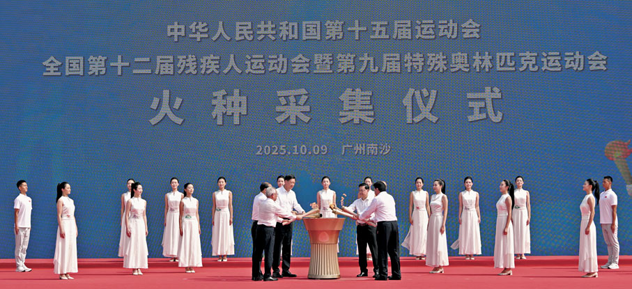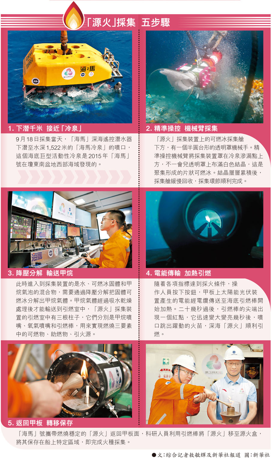 深海逐夢,燃冰成炬。9日上午,在中國首艘自主研發建造的大洋鑽探船「夢想」號見證下,第十五屆全國運動會和全國第十二屆殘疾人運動會暨第九屆特殊奧林匹克運動會火種採集儀式在位於廣州南沙區的廣州海洋地質調查局科考碼頭舉行。十五運會和殘特奧會的火種採集分為「源火」採集和「聖火」點燃兩個階段。在「源火」採集階段,通過在南海北部海域深海海底採集可燃冰,並在原位引燃生成「源火」,實現了「深海逐夢、燃冰成炬」的創舉,這是全球體育運動史上首次在深海海底獲取綠色「火種」。●香港文匯報記者 敖敏輝、帥誠 廣州報道