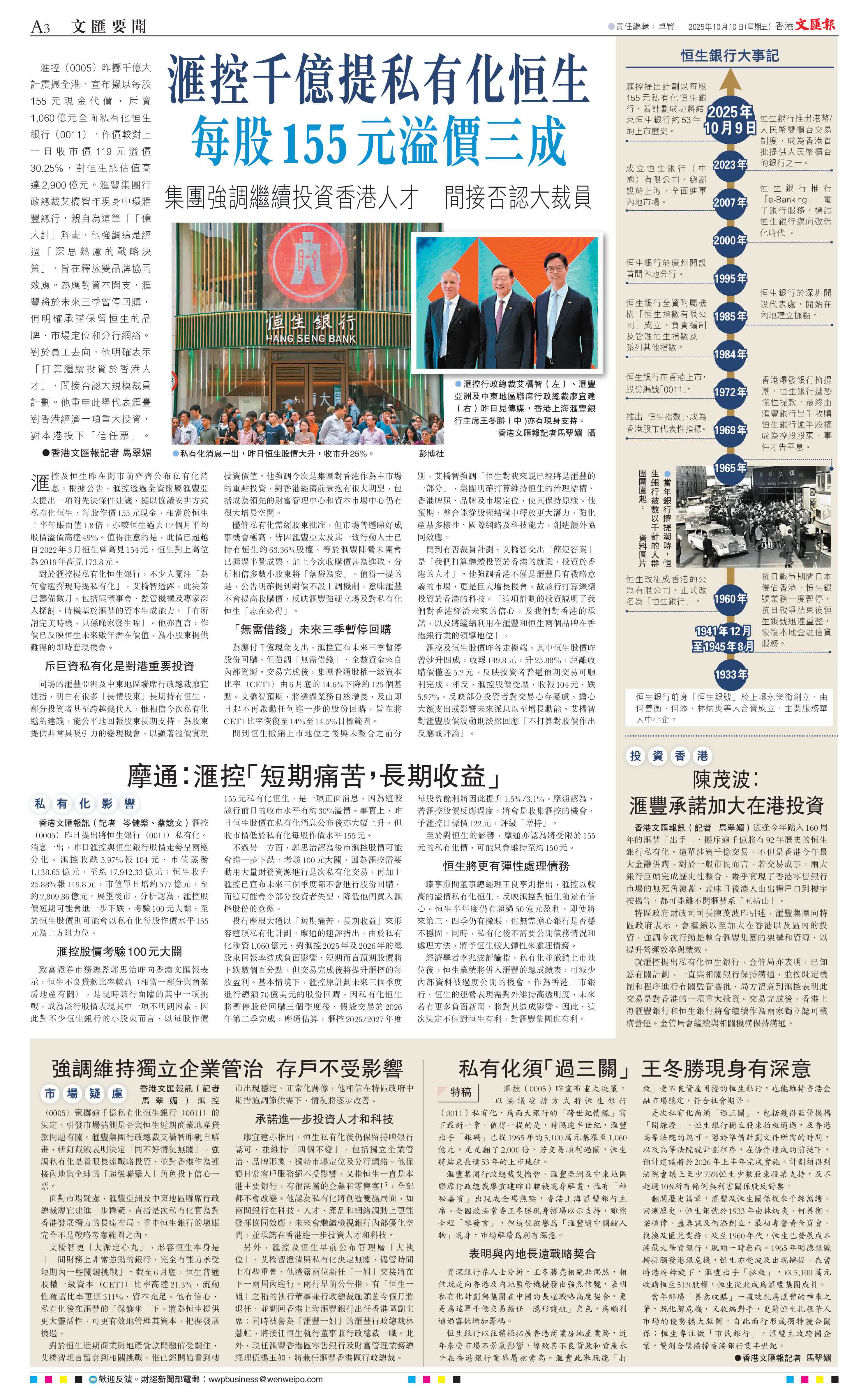 艾橋智更「大派定心丸」,形容恒生本身是「一間財務上非常強勁的銀行,完全有能力承受短期內一些關鍵挑戰」。截至6月底,恒生普通股權一級資本(CET1)比率高達21.3%,流動性覆蓋比率更達311%,資本充足。他有信心,私有化後在滙豐的「保護傘」下,將為恒生提供更大靈活性,可更有效地管理其資本,把握發展機遇。