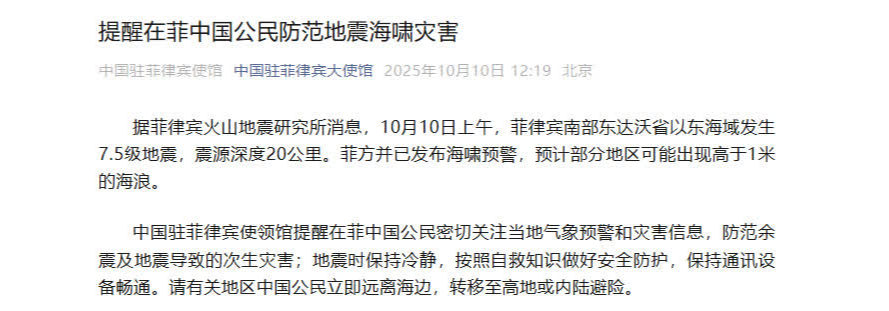 據菲律賓火山地震研究所消息,10月10日上午,菲律賓南部東達沃省以東海域發生7.5級地震,震源深度20公里。菲方並已發布海嘯預警,預計部分地區可能出現高於1米的海浪。