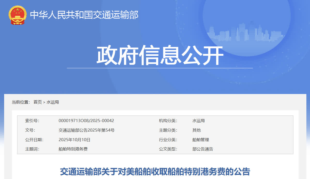 據交通運輸部網站消息,2025年4月17日,美國貿易代表辦公室發布關於對中國海事、物流及造船業301調查措施,自2025年10月14日起,將對中國企業擁有或經營的船舶、中國籍船舶及中國造船舶加收港口服務費,嚴重違背了國際貿易相關原則和中美海運協定,對中美間海運貿易造成嚴重破壞。