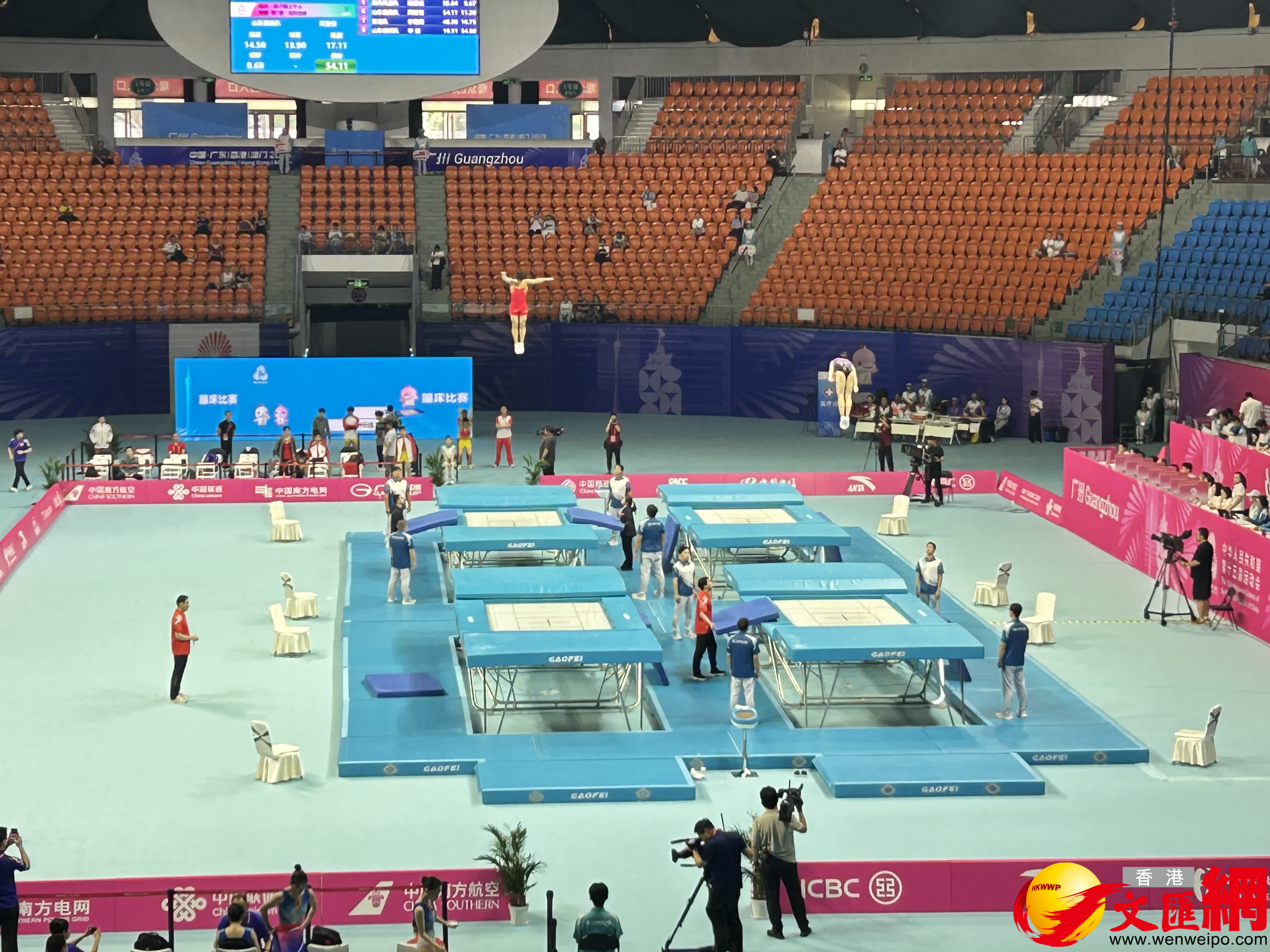 (香港文匯網記者 敖敏輝 廣州報道)10日,十五運會體操(蹦床)項目在廣州體育館開賽,來自全國13支隊伍在3天角逐團體、個人項目4枚金牌。記者了解到,蹦床是十五運會競賽開賽以來首個有現役奧運冠軍參賽的項目,東京奧運會女子蹦床金牌選手朱雪瑩代表天津隊出戰。香港蹦床隊共派出兩名曾參加亞運會比賽的選手(男女各一名)參賽,這也是港隊歷史首次參加全運會蹦床比賽。港隊隊員認為,十分享受參加全運會頂級比賽,相信是一次極佳的歷練機會。