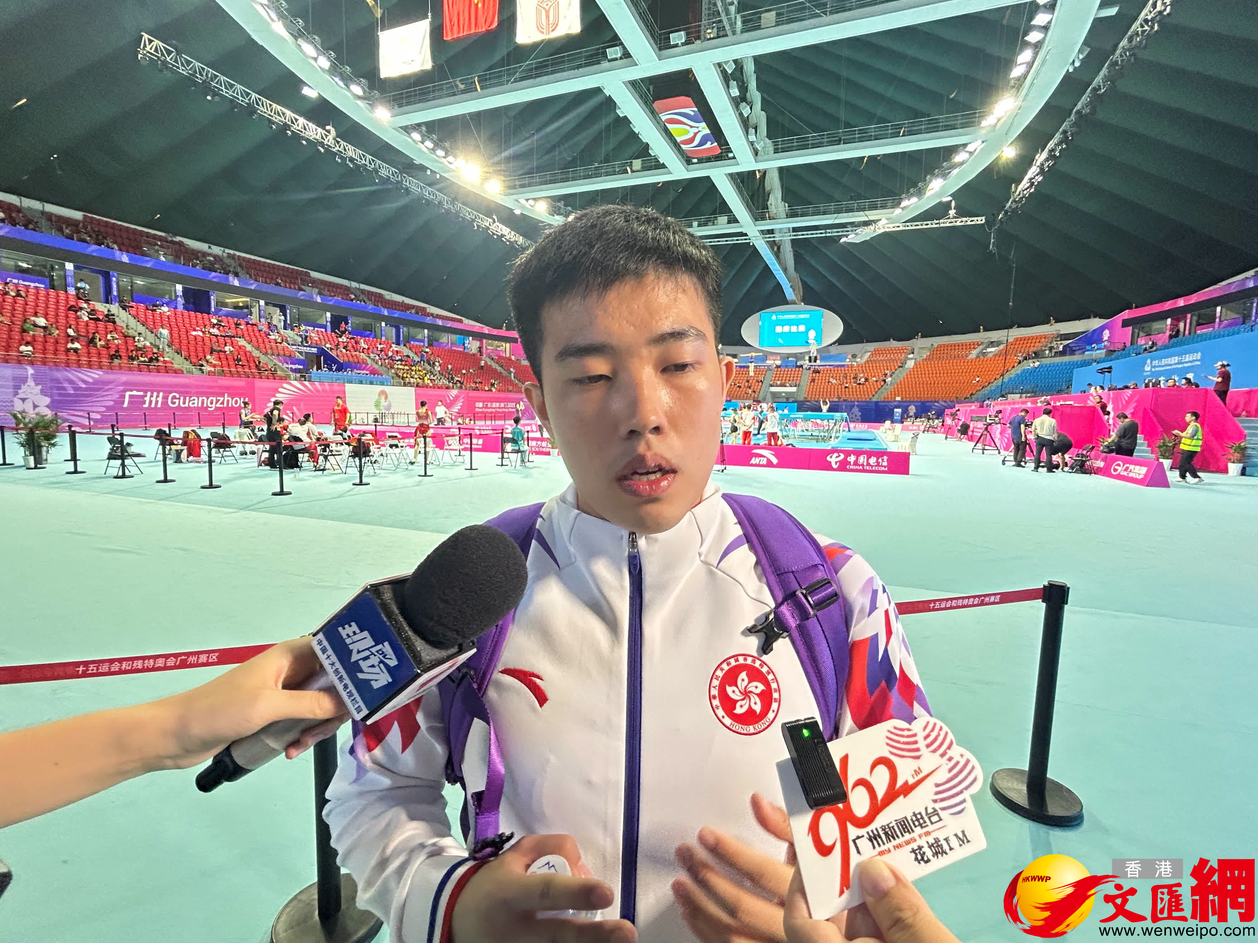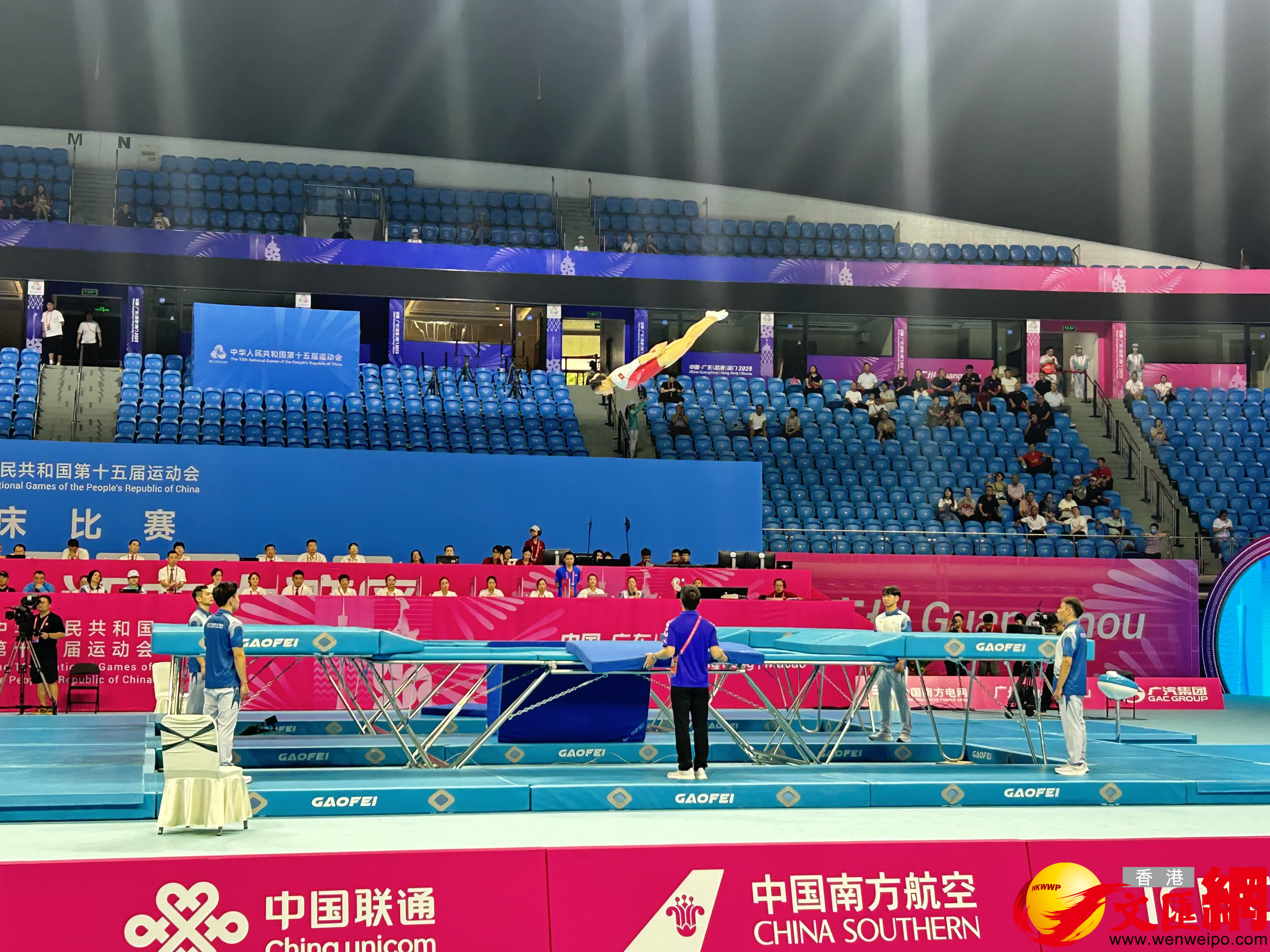 李冠緯介紹,和香港本地的蹦床比賽相比,十五運會賽場的設施先進、場地大,觀眾也很多,在這裏比賽非常享受。