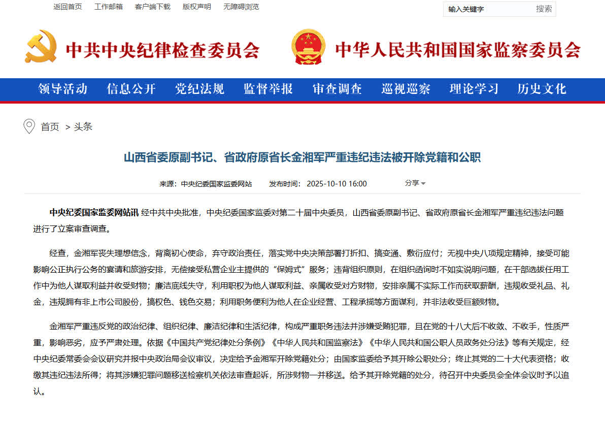 據中央紀委國家監委網站消息,經中共中央批准,中央紀委國家監委對第二十屆中央委員,山西省委原副書記、省政府原省長金湘軍嚴重違紀違法問題進行了立案審查調查。