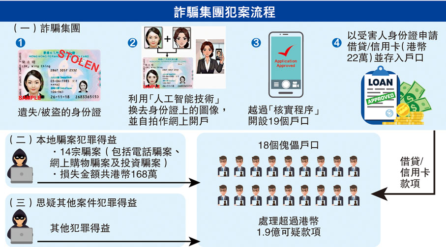 該詐騙集團總共向7間銀行及儲值支付工具遞交合共23次網上開戶申請,其中19次成功通過身份驗證程序開戶,繼而利用這些戶口申請借貸及信用卡,涉案金額約港幣22萬元。