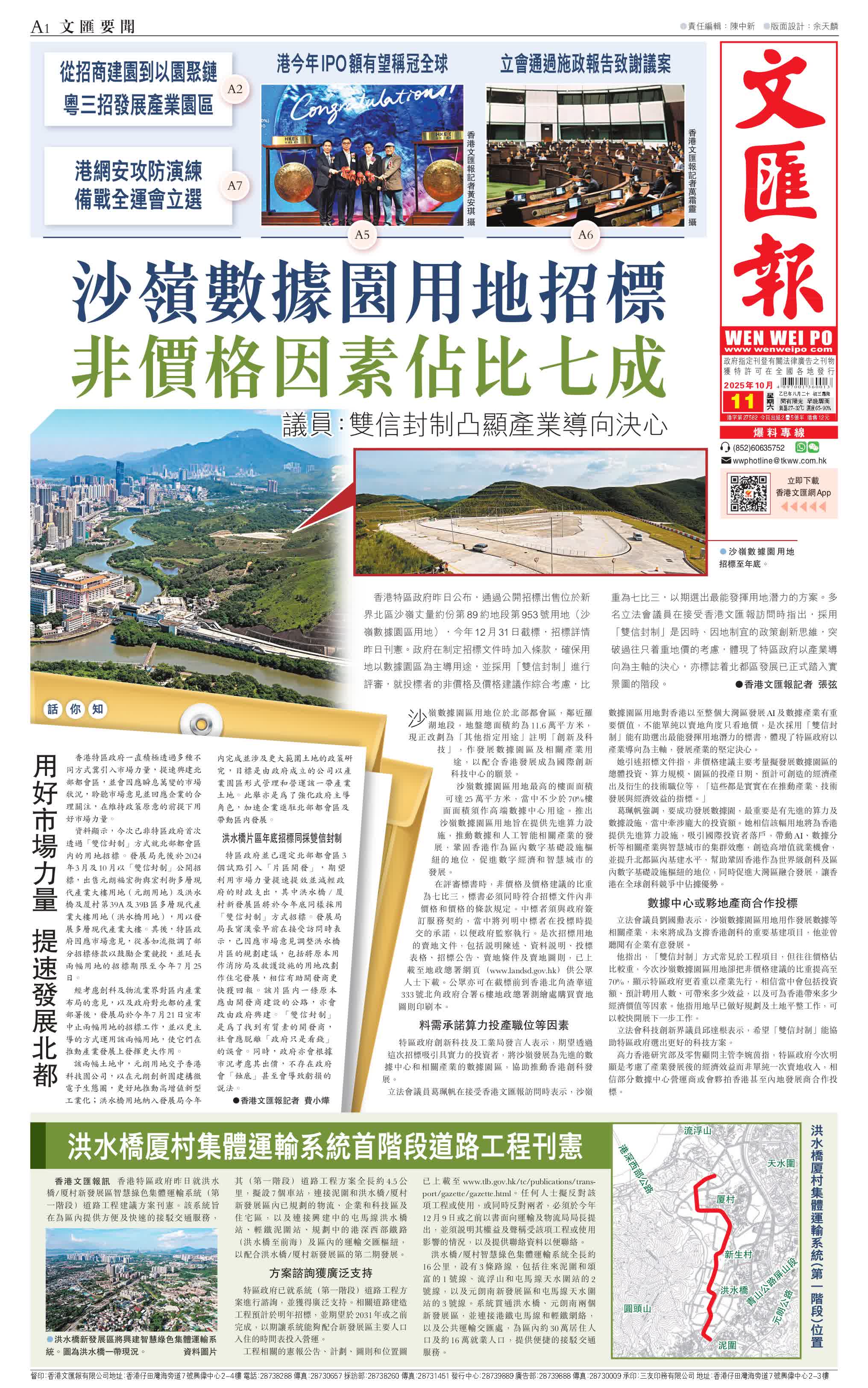 香港文匯報訊(記者 張弦)香港特區政府昨日公布,通過公開招標出售位於新界北區沙嶺丈量約份第89約地段第953號用地(沙嶺數據園區用地),今年12月31日截標,招標詳情昨日刊憲。政府在制定招標文件時加入條款,確保用地以數據園區為主導用途,並採用「雙信封制」進行評審,就投標者的非價格及價格建議作綜合考慮,比重為七比三,以期選出最能發揮用地潛力的方案。多名立法會議員在接受香港文匯報訪問時指出,採用「雙信封制」是因時、因地制宜的政策創新思維,突破過往只着重地價的考慮,體現了特區政府以產業導向為主軸的決心,亦標誌着北都區發展已正式踏入實景圖的階段。