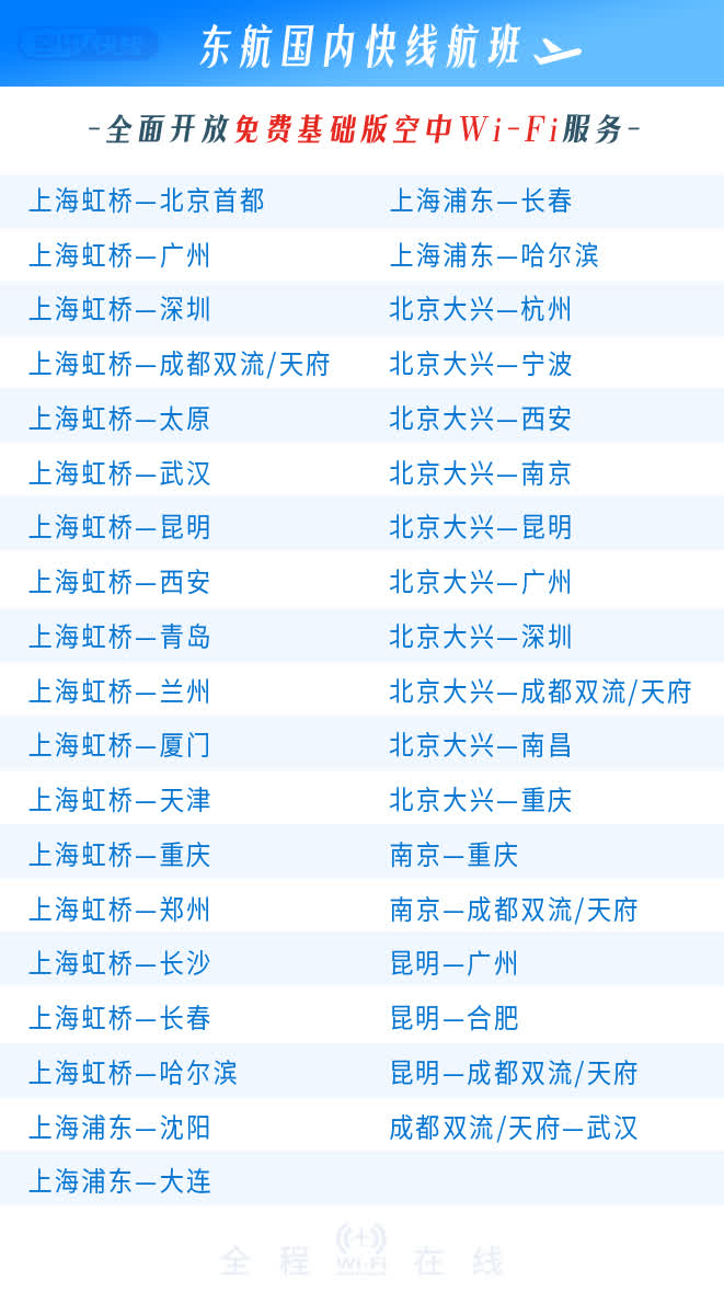 據央視新聞報道,記者從中國東方航空了解到,從10月11日起,該航司所有寬體機執行的國內「空中快線」航班提供經濟艙全艙位免費Wi-Fi服務,滿足旅客空中用網免費、上網便捷的需求。