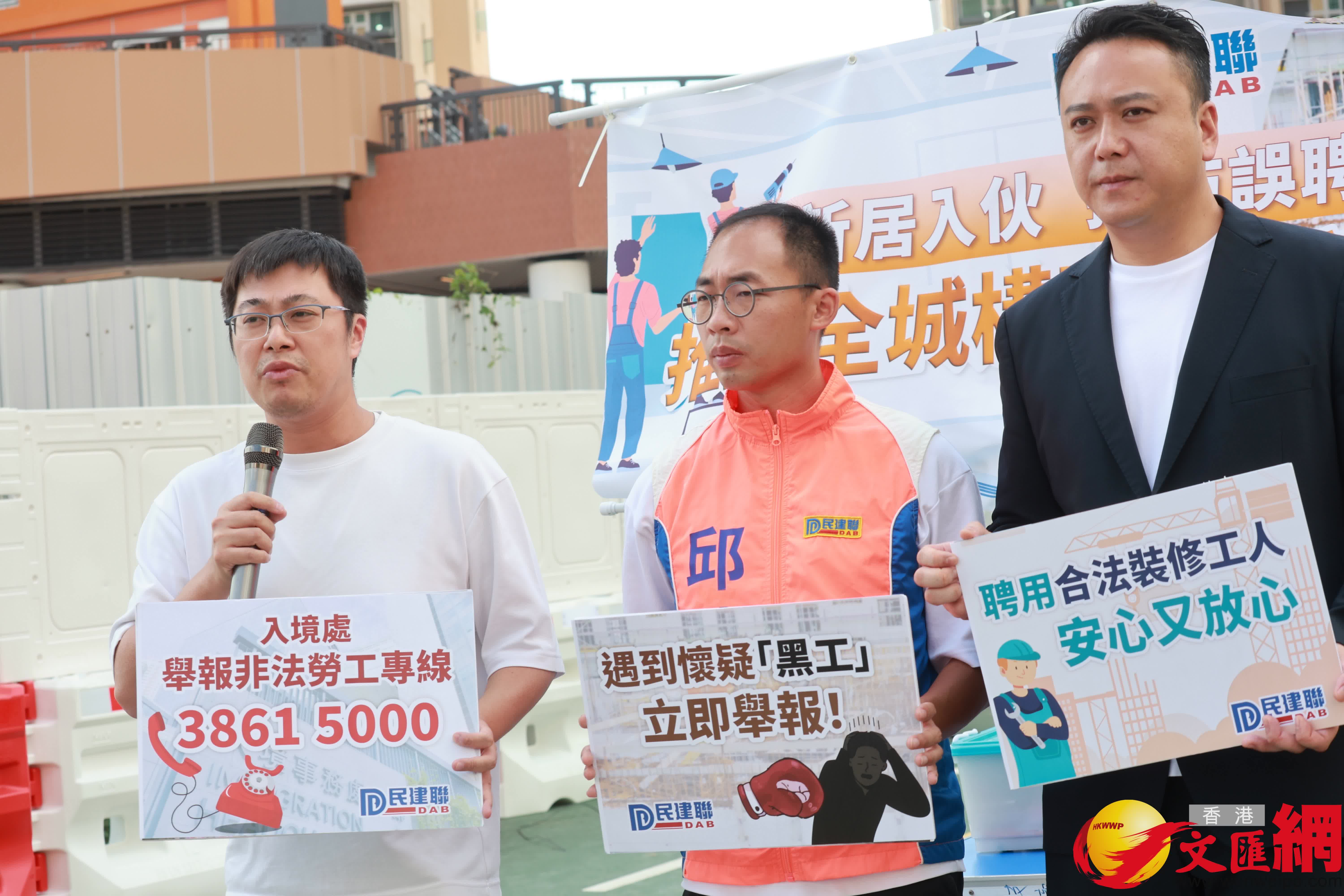 香港文匯報訊(記者 李千尋)觀塘安達臣道多個屋苑近日入伙,居民陸續聘請裝修公司為新居置裝。民建聯人力事務發言人、立法會議員顏汶羽、立法會議員李世榮及西貢區議員邱浩麟今日(11日)下午於安楹苑外向居民派發宣傳單張,提醒居民切勿誤聘「黑工」,墮入法網;並呼籲物管公司及居民遇到懷疑有「黑工」進出屋苑,應該致電入境處舉報黑工專線,推動全城構建「監察黑工網絡」。