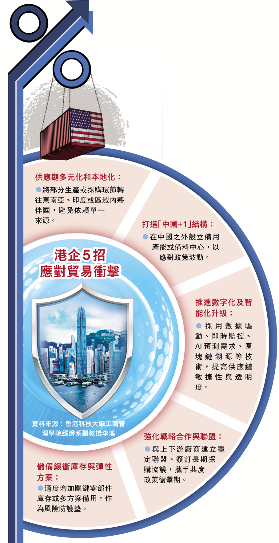 中美貿易戰急劇升級。美國總統特朗普在社交平台發文稱,11月1日起(或更早)對華加徵100%關稅,並對關鍵軟件產品實施新的出口管制;對中國船舶徵收港口服務費亦將從本月14日起實施。中國連日來則採取多項反制措施,包括升級稀土出口管制、將14家美企列入制裁名單以及對停泊在中國港口的美國船舶收取特別港務費等。香港文匯報記者昨日訪問多位學者指出,美國將香港與內地納入同等關稅體系,因此新一輪關稅戰中,香港作為全球貿易中心、航運中心及科創中心可能受到一定負面影響,但仍有應對衝擊的充足空間。有學者呼籲香港企業進一步適應外部變化,積極推動供應鏈多元化、生產智能化以及技術自主可控等,與上下游廠商建立更穩定合作關係,來增強企業發展的韌性和競爭力。 ●香港文匯報記者 黎梓田、朱燁