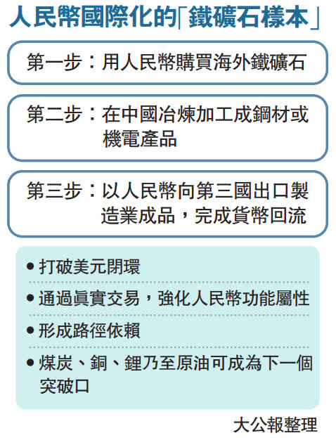 目前,巴西淡水河谷、澳洲第二大鐵礦企業力拓已同意與華用人民幣結算;澳洲第三大鐵礦企業、全球第四大鐵礦石生產企業FMG(福德士河集團)不僅接受人民幣結算,今年8月還向中國銀團申請142億人民幣貸款用於礦區建設,未來以鐵礦石償還,主動綁定中國市場。業界相信,中方與必和必拓達成協議,減少依賴美元進行大宗商品結算,可以提升中國的經濟安全,並加速人民幣國際化。