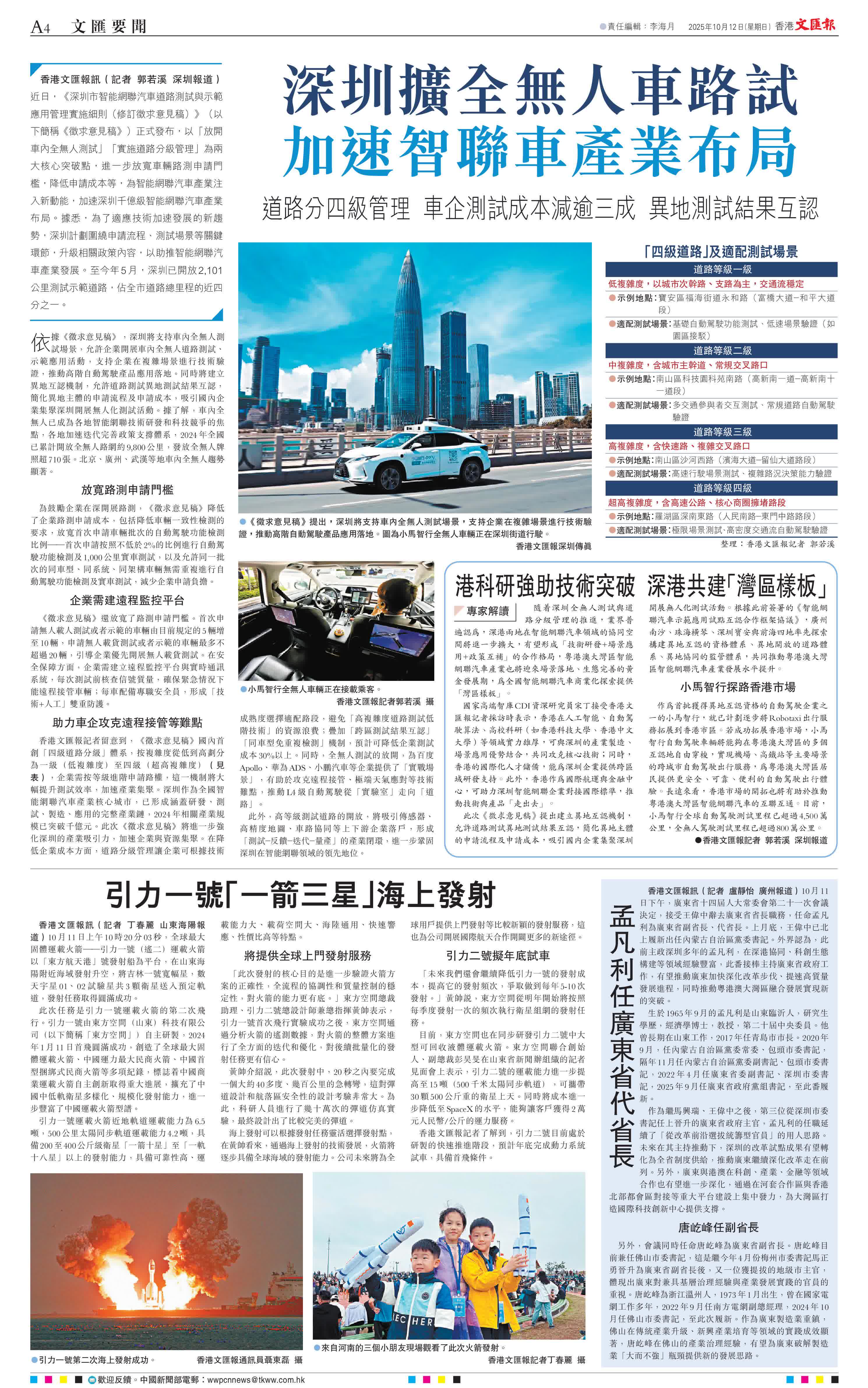 國家高端智庫CDI資深研究員宋丁接受香港文匯報記者採訪時表示,香港在人工智能、自動駕駛算法、高校科研(如香港科技大學、香港中文大學)等領域實力雄厚,可與深圳的產業製造、場景應用優勢結合,共同攻克核心技術;同時,香港的國際化人才儲備,能為深圳企業提供跨區域研發支持。此外,香港作為國際航運與金融中心,可助力深圳智能網聯企業對接國際標準,推動技術與產品「走出去」。
