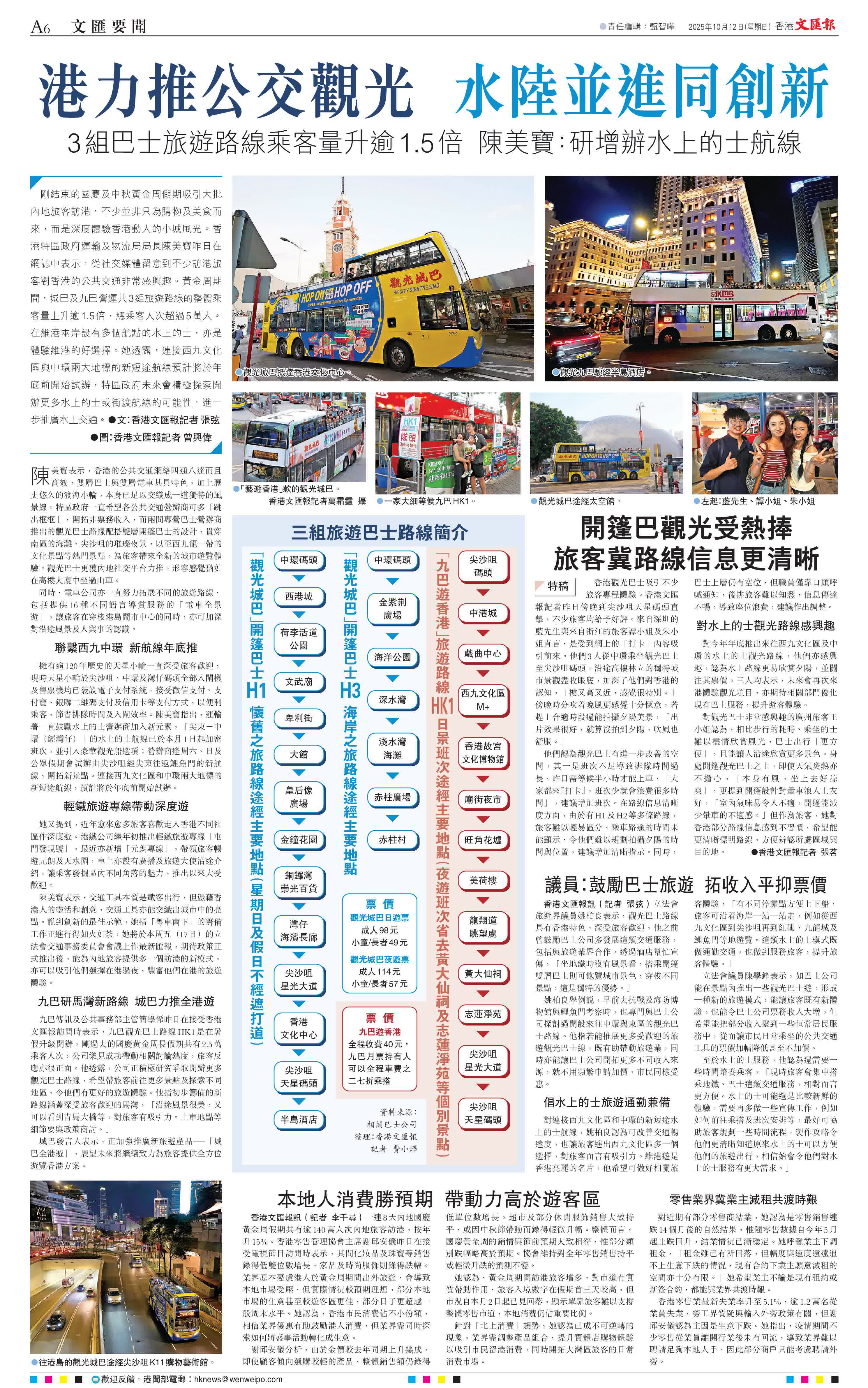 對觀光巴士非常感興趣的廣州旅客王小姐認為,相比步行的耗時、乘坐的士難以盡情欣賞風光,巴士出行「更方便」,且能讓人沿途欣賞更多景色。身處開篷觀光巴士之上,即使天氣炎熱亦不擔心,「本身有風,坐上去好凉爽」,更提到開篷設計對暈車浪人士友好,「室內氣味易令人不適,開篷能減少暈車的不適感。」但作為旅客,她對香港部分路線信息感到不習慣,希望能更清晰標明路線,方便辨認所處區域與目的地。
