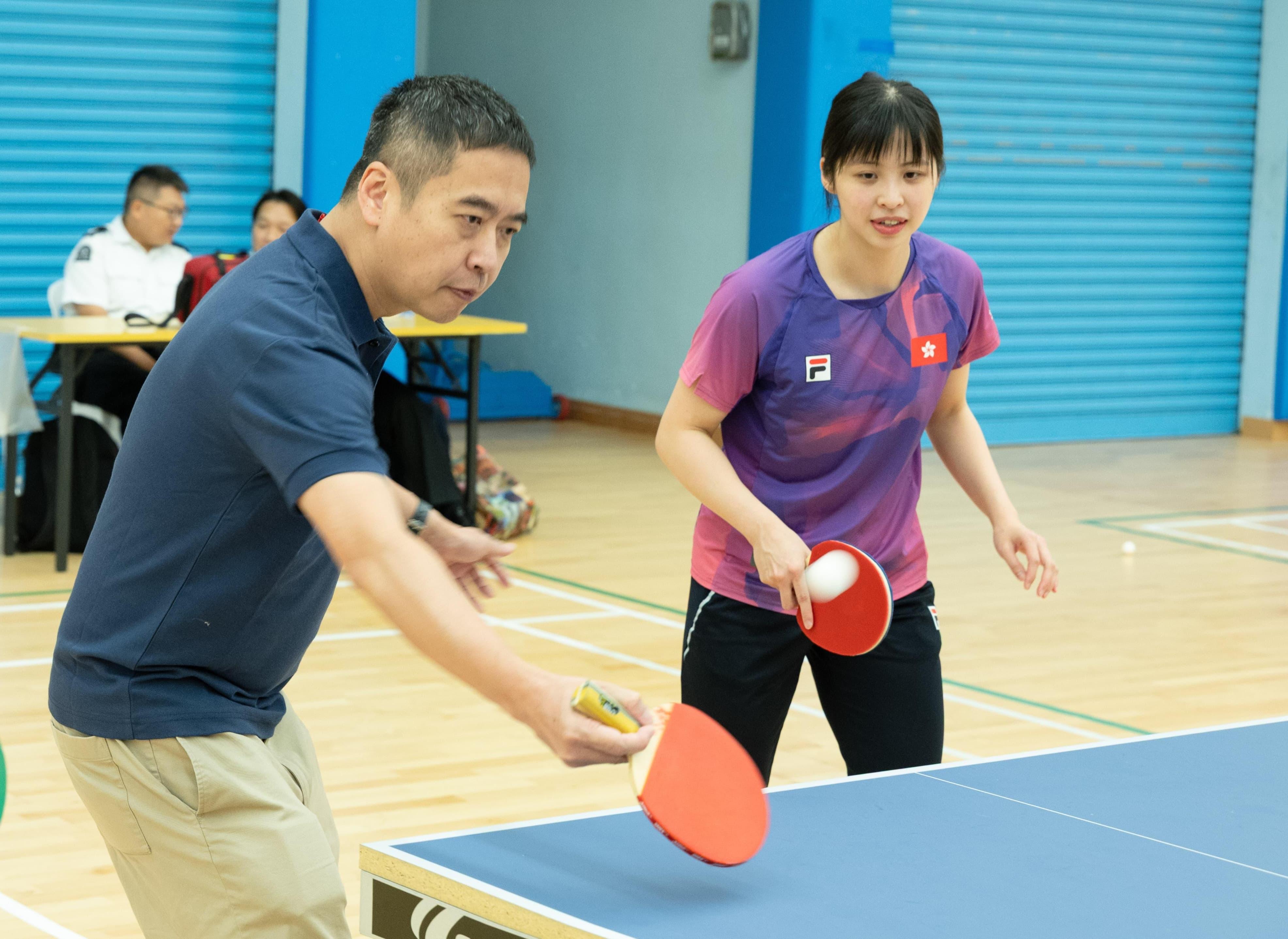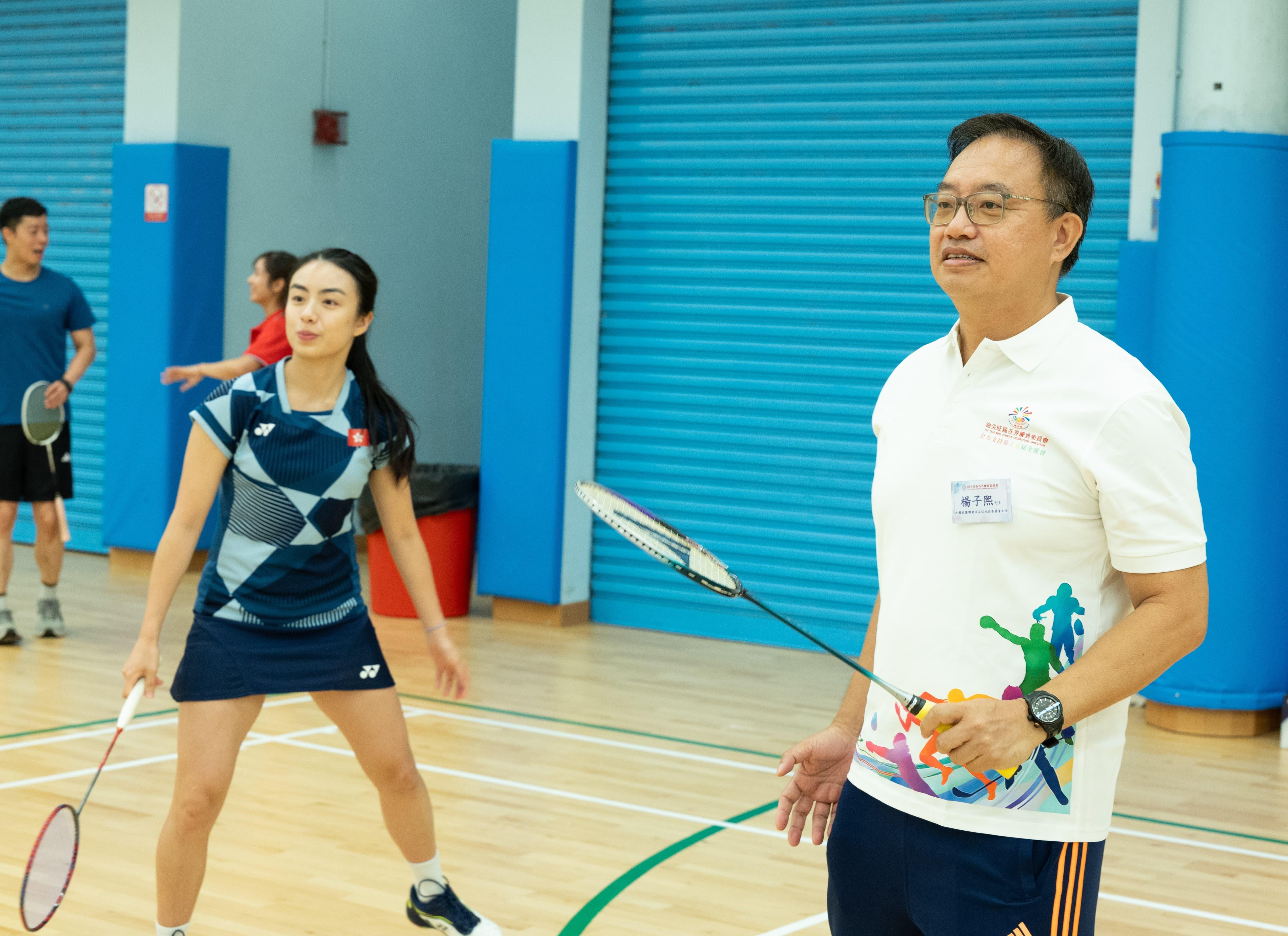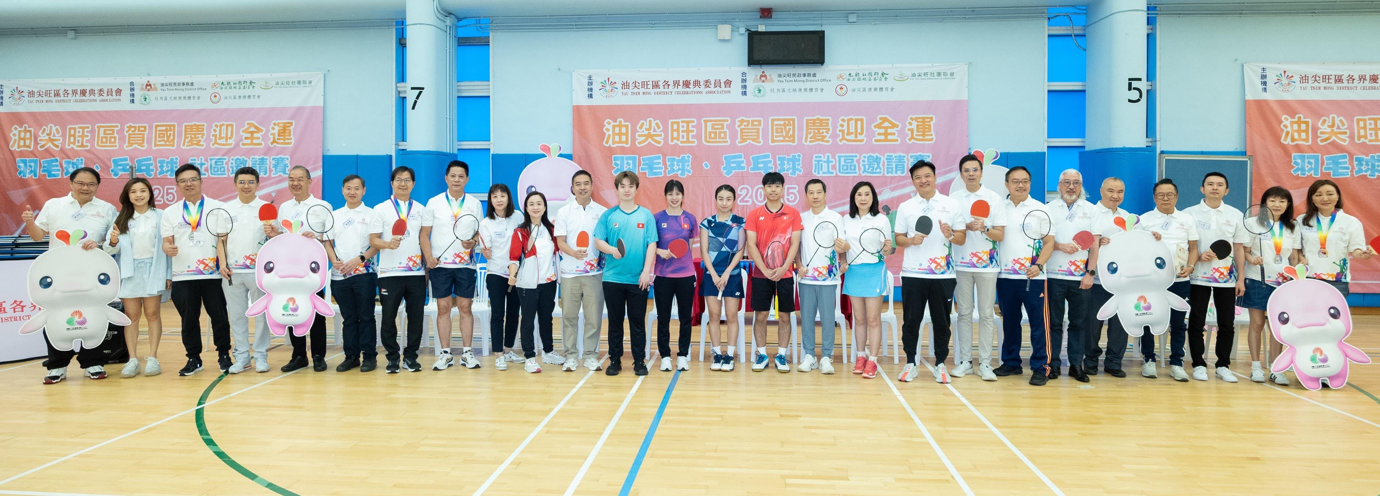 大會特邀中國瑞昌羽毛球大師賽混雙冠軍吳芷柔以及2025全港羽毛球錦標賽男雙冠軍鄒軒朗,以及港隊乒乓球運動員蔡俊杰、林依諾親臨現場,和主禮嘉賓包括中央政府駐港聯絡辦九龍工作部副部長李文彬、油尖旺民政事務專員余健強、立法會議員鄭泳舜、陳凱欣、梁文廣、油尖旺區康樂事務經理鄧穎思及多位區內領袖,一齊為大家獻上了精彩的嘉賓示范賽。