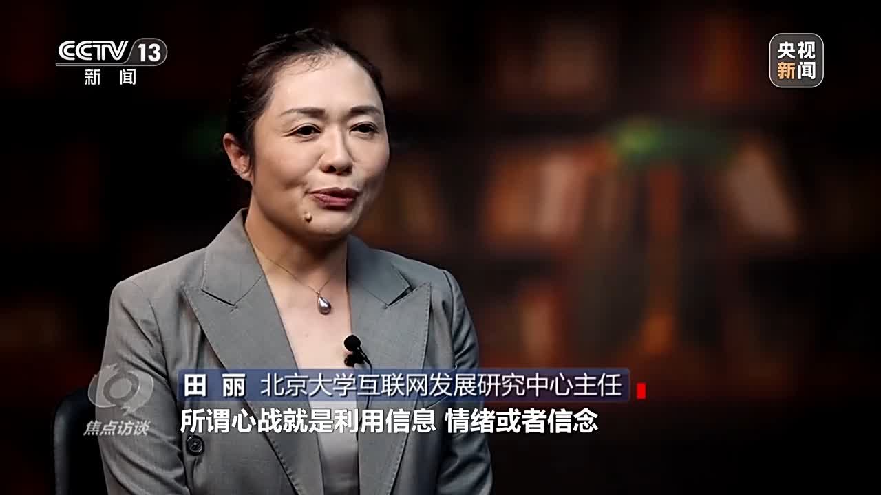 北京大學互聯網發展研究中心主任 田麗:所謂心戰就是利用信息、情緒或者信念摧毀對方的意志,不需要硝煙,依舊能夠對人產生威脅。利用各種媒介產品,包括謠言或者其他心理暗示,讓人放棄自我主張。認知戰是心理戰的升級版,通過比如控制你的信源,誘導你按照他的思路去加工信息。認知戰的危害不在於它讓人倒下,而在於它讓社會分裂。