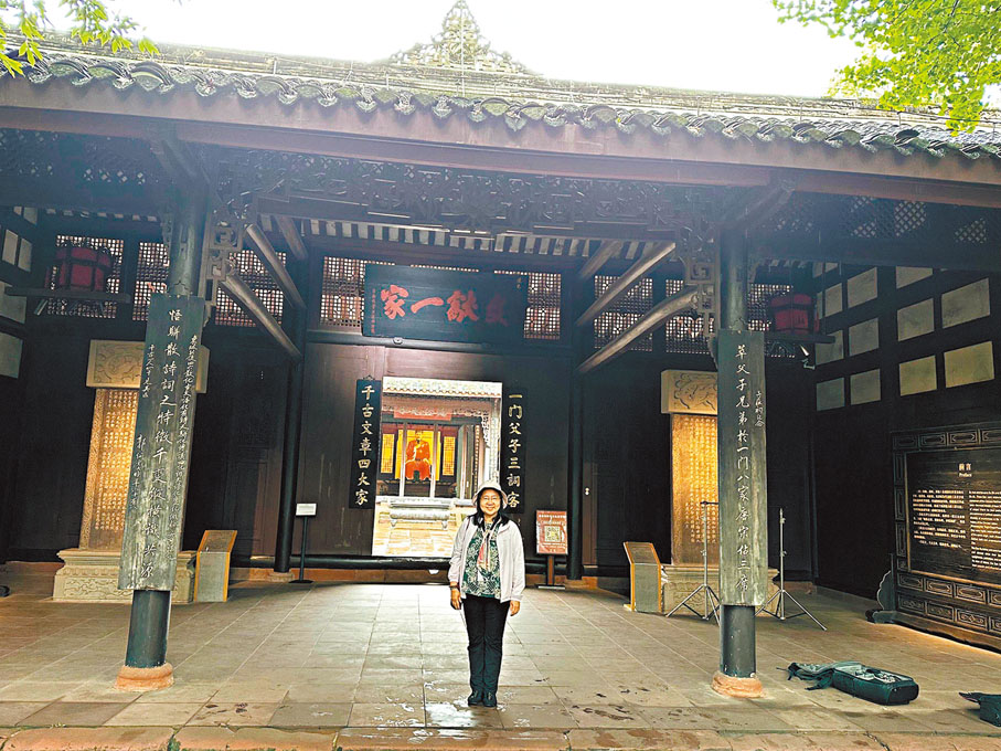 我隨團到此遊三蘇祠,跨進朱紅色門檻,迎來身穿漢服的美顏講解員,她指向庭院兩棵樹,講述那是代表蘇軾、蘇轍兩兄弟的樹。其父蘇洵的樹是千年古木黃葛樹,枝葉茂盛。三蘇父子是文壇名家,難怪館前有對聯讚「一門父子三詞客,千古文章四大家」。