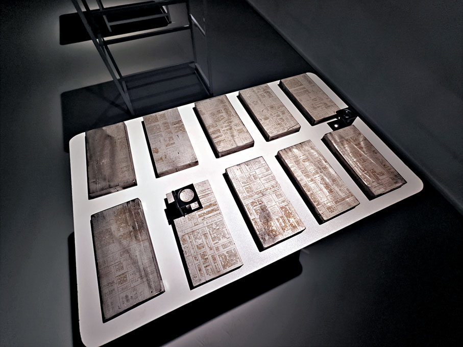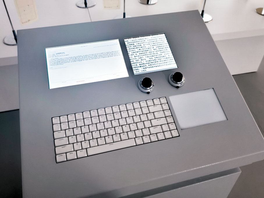 作品《幕與投射的背面》由多個部分組成,包括寫有數獨題目的旗幟;這些旗幟的材料是書法用紙。對陳朗丰來講,書法就是一種修為。他還在其中一面旗幟上寫下了自己在準備此次展覽時的孤獨感:「無量自數獨 策雅興」。他表示,無論是在準備過程中,還是展覽呈現期間,都沒有太多人理解他在做什麼,「好像是自己在數孤獨」。觀眾可通過控制台的交互文本框提交反饋;這些數據將被轉化為新的策略,融入投影文本中。