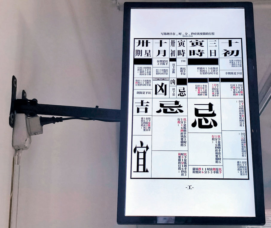 作品《二四新通書》由40件激光雕刻的鋼板及雙頻錄像組成,包含中國傳統文化「通勝」(又稱黃曆)元素。陳朗丰在通勝邏輯的基礎上,向AI詢問自己每分每秒的活動。鋼板正面是AI對他的建議與要求,背面則是他人給他及此作品的評價。