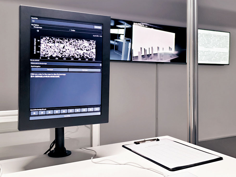 作品《屏風內的生命》則包含陳朗丰自製的一個程式。他導入了NASA系外行星檔案館的即時數據,讓阿里巴巴的AI大模型「通義千問」在其中遊覽、感受。電腦屏幕上的頁面則會顯示AI的旅行日記,「有趣的是,我們也沒有去過那些星球,所以不知道這些紀錄是真是假。」而當陳朗丰不清楚天文單位「AU」是天體軌道的偏心率時,他也能通過AI理解。即便如此,AI對他來講仍像一個孩子,「它是一個物種,一定會在某些方面比我們厲害。」