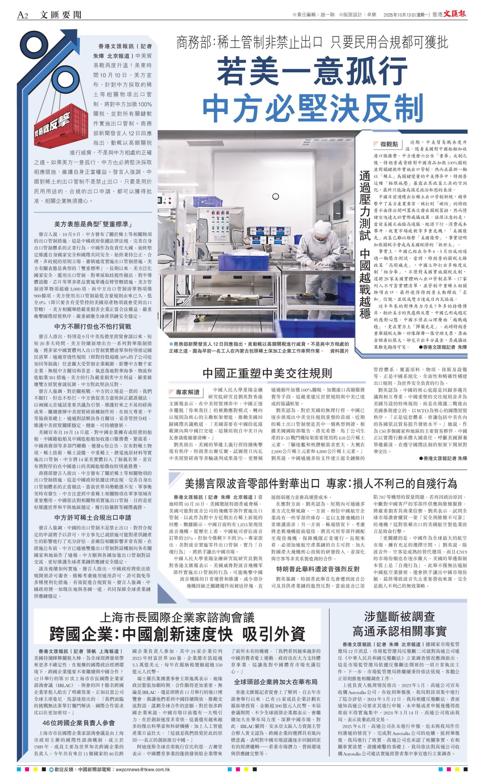 香港文匯報訊(記者 朱燁 北京報道)中美貿易戰再度升溫!美東時間10月10日,美方宣布,針對中方採取的稀土等相關物項出口管制,將對中方加徵100%關稅,並對所有關鍵軟件實施出口管制。商務部新聞發言人12日回應指出,動輒以高額關稅進行威脅,不是與中方相處的正確之道。如果美方一意孤行,中方也必將堅決採取相應措施,維護自身正當權益。發言人強調,中國對稀土的出口管制不是禁止出口,只要是用於民用用途的、合規的出口申請,都可以獲得批准,相關企業無須擔心。