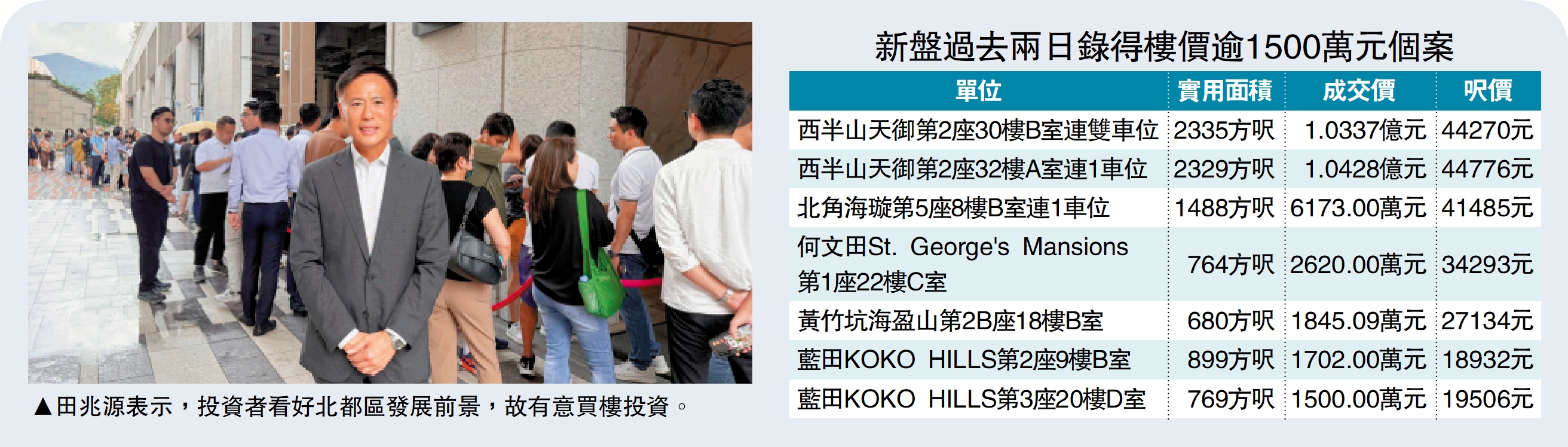 貴價一手豪宅仍然不乏成交。恒地及新世界發展的西半山天御,昨日便以招標方式售出第2座30樓B室及32樓A室兩個單位。前者連兩個車位的成交價逾1.03億元,買家採210天成交期付款辦法及若提早完成交易,可再獲樓價2.39%折扣優惠,發展商則代繳印花稅;後者連1個車位的成交價逾1.04億元,買家採150日成交期付款辦法。該盤上月底至今暫售出4個單位,套現逾6.7億元;恒地等昨日隨即再安排該盤第2座31樓B室及33樓A室於本周四起招標出售。