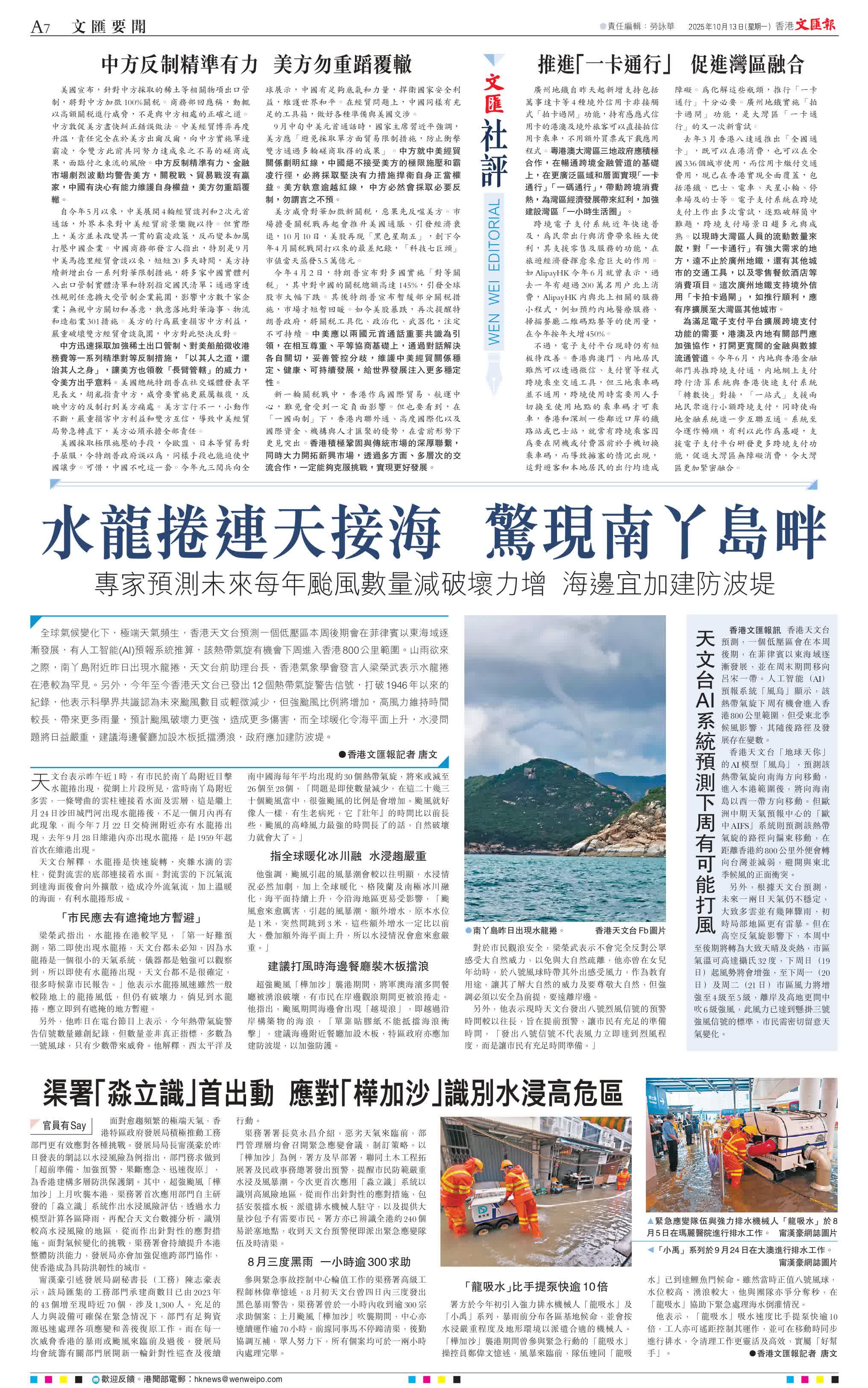 另外,根據天文台預測,未來一兩日天氣仍不穩定,大致多雲並有幾陣驟雨,初時局部地區更有雷暴。但在高空反氣旋影響下,本周中至後期將轉為大致天晴及炎熱,市區氣溫可高達攝氏32度,下周日(19日)起風勢將會增強,至下周一(20日)及周二(21日)市區風力將增強至4級至5級,離岸及高地更間中吹6級強風,此風力已達到懸掛三號強風信號的標準,市民需密切留意天氣變化。