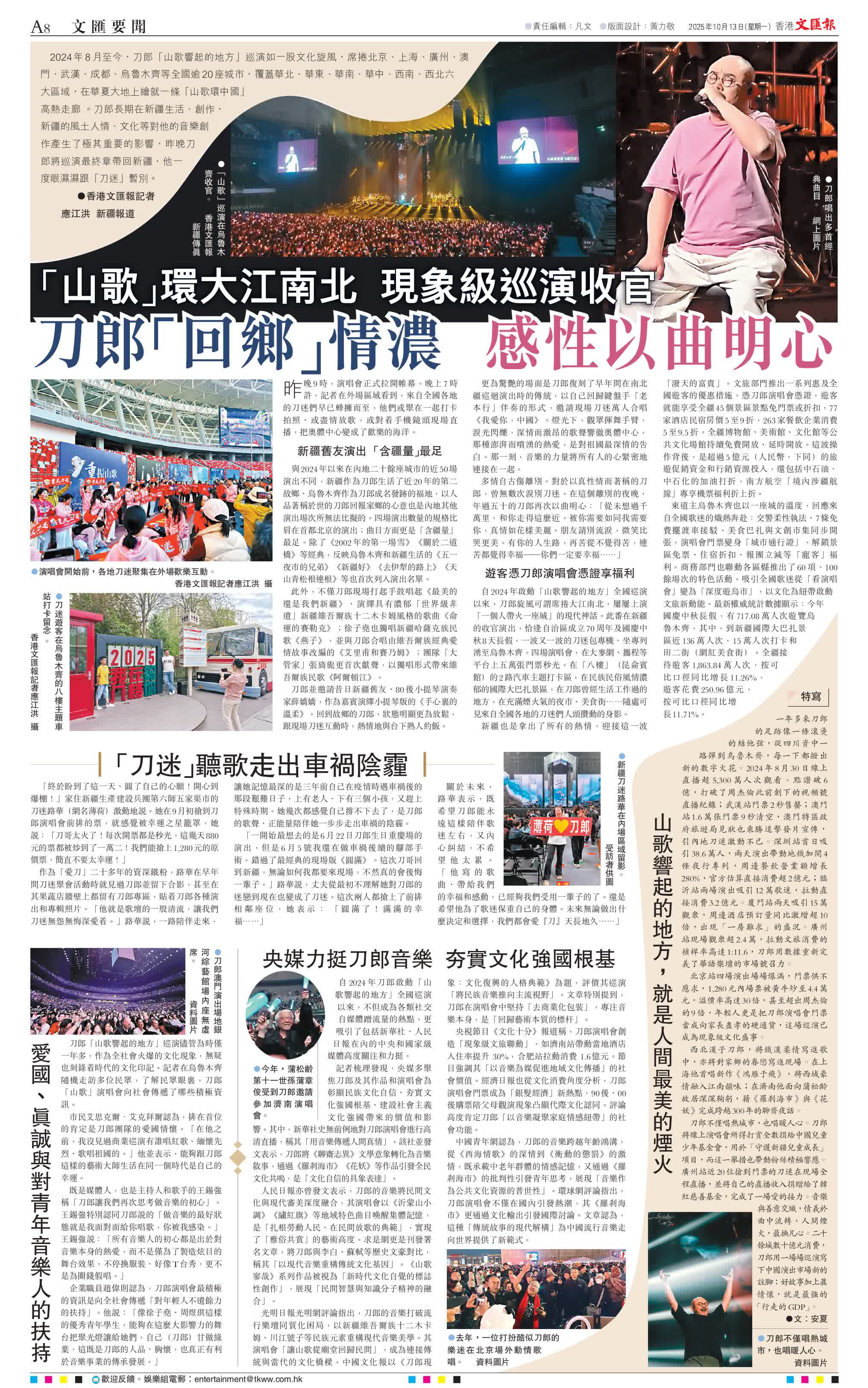 香港文匯報訊(記者 應江洪 新疆報道)2024年8月至今,刀郎「山歌響起的地方」巡演如一股文化旋風,席捲北京、上海、廣州、澳門、武漢、成都、烏魯木齊等全國逾20座城市,覆蓋華北、華東、華南、華中、西南、西北六大區域,在華夏大地上繪就一條「山歌環中國」高熱走廊 。刀郎長期在新疆生活、創作,新疆的風土人情、文化等對他的音樂創作產生了極其重要的影響,昨晚刀郎將巡演最終章帶回新疆,他一度眼濕濕跟「刀迷」暫別。