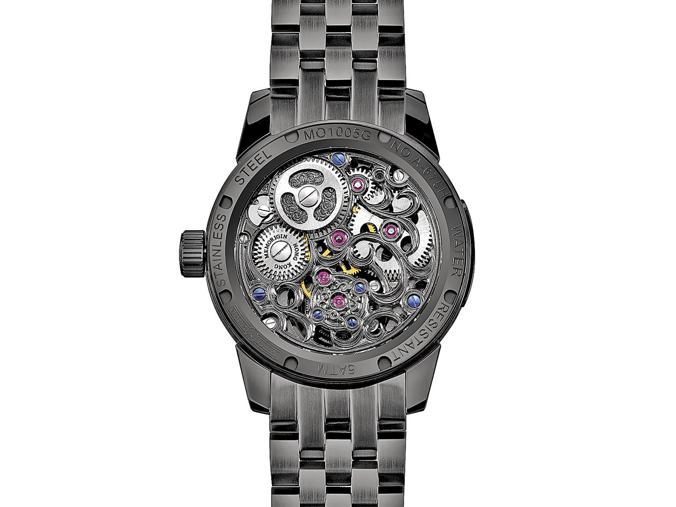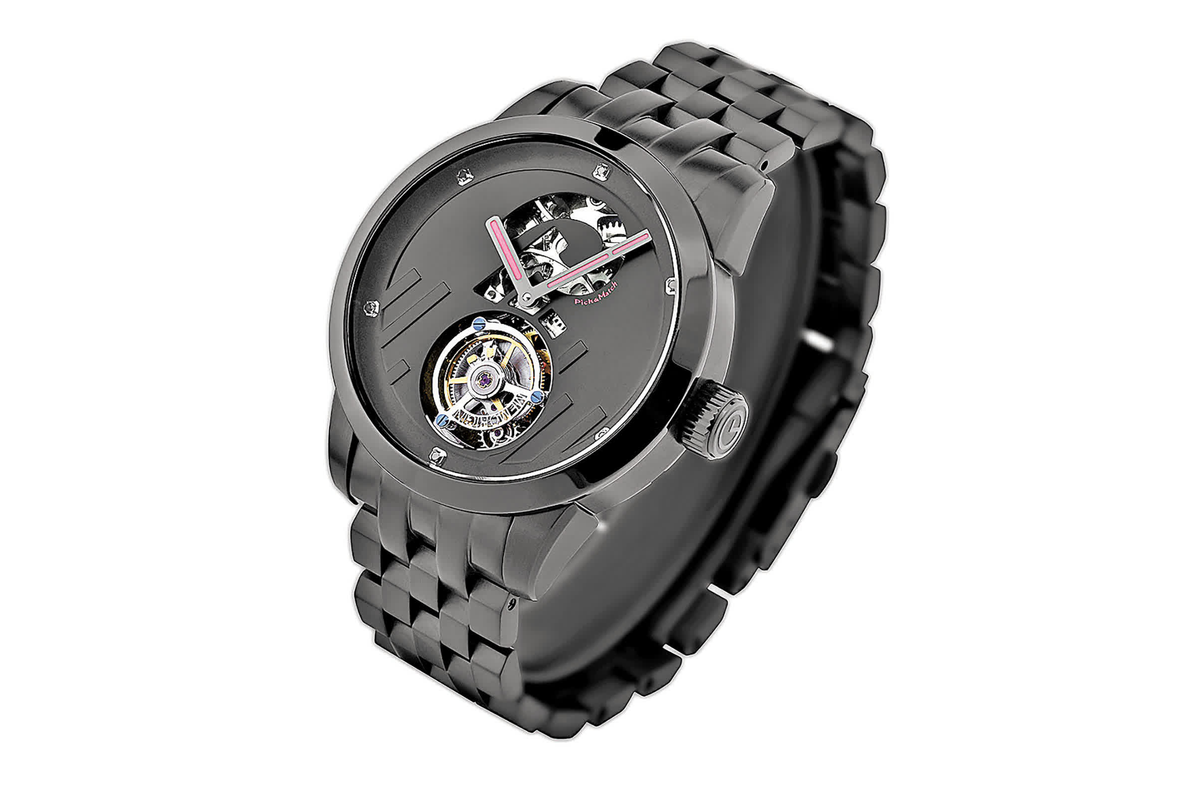 腕錶配備由155件組件及18顆寶石軸承組裝成的陀飛輪機芯,含40小時動力儲備,採用時尚的黑色設計,12時位置是鏤空的Pick and Match商標,透視陀飛輪機芯精密的零件,而錶盤的下半部分則飾以數條立體效果的條線,代表運動的節奏,更鑲嵌六顆黑鑽作為時間刻度,而指針則加入品牌的代表顏色桃紅色作點綴,並配備PVD鍍黑精鋼鍊帶,易於配襯不同時尚造型。
