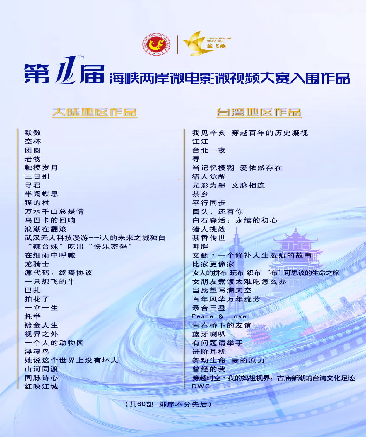 (香港文匯網記者 歐陽思柔)作為海峽兩岸微電影微視頻攝製達人年度盛典的「金飛燕」海峽兩岸微電影微視頻大賽,經過分組審片、交叉審片、專家評議等程序,以投票的方式評選出60件入圍提名作品。大賽組委會10月13日公布了來自台灣地區和大陸地區各30件作品的名單,這些作品將進入大賽終評環節,並在年終的頒獎典禮上公布最終評選結果。