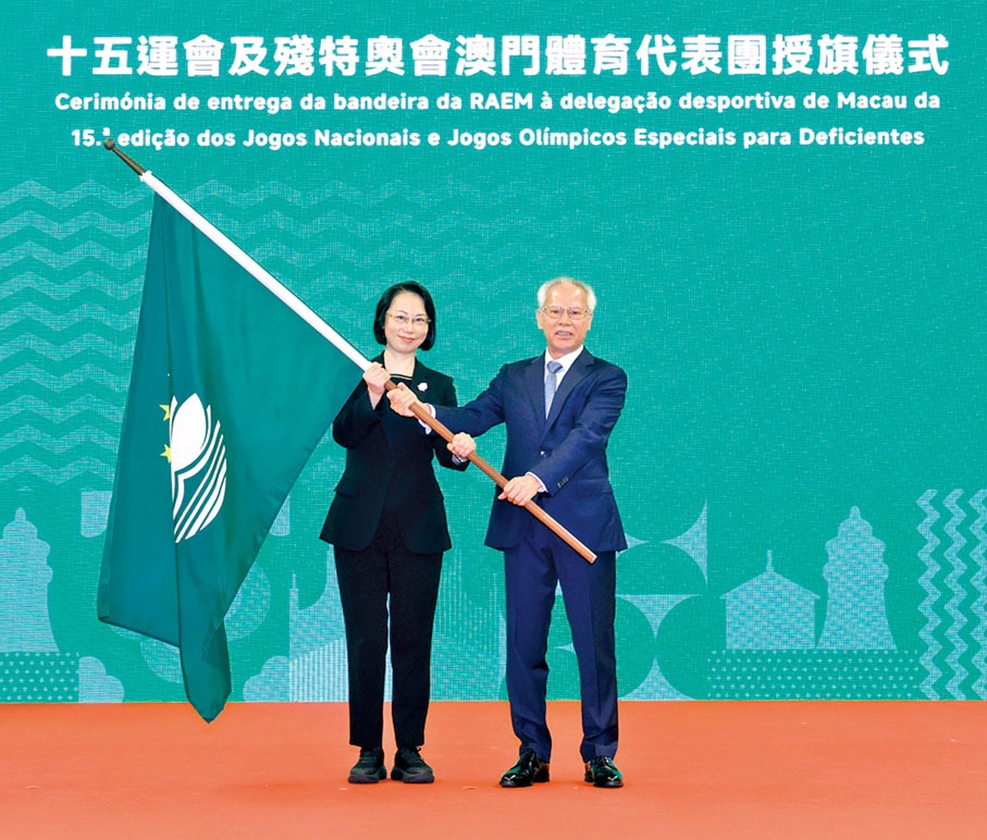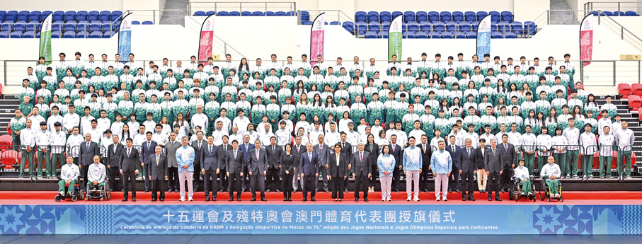 第十五屆全國運動會和全國第十二屆殘疾人運動會暨第九屆特殊奧林匹克運動會將於本年11月及12月舉行,首次由粵港澳三地共同承辦。為激勵澳門健兒爭創佳績,並凝聚志願者力量展現東道主風采,澳門特區日前舉行澳門體育代表團授旗儀式,以及志願者誓師大會。