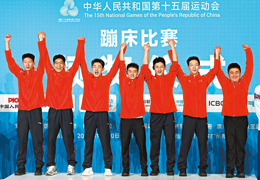 本屆全運會蹦床團體比賽有如「神仙打架」,江蘇、山西、湖南、廣東、福建均具備奪金實力。在11日舉行的男子團體決賽中,江蘇隊由孫逸辰、王梓賽、錢雨凡、楊謹組成,其中,王梓賽是巴黎奧運會銀牌得主,他也為全隊貢獻了最高分,最終,江蘇隊以總分182.24分摘金。鄒詔政、陳昱翰、王家陽、喻煒傑組成的浙江隊得到180.56分,從預賽第5逆襲奪得銀牌。嚴浪宇、賀龍雨、熊宇權、胡康旭組成的湖南隊得到177.26分獲得銅牌。