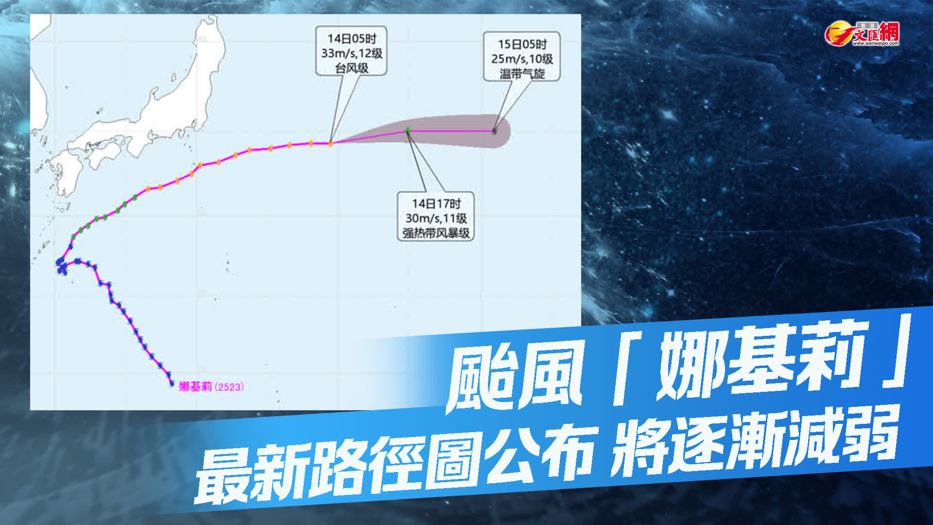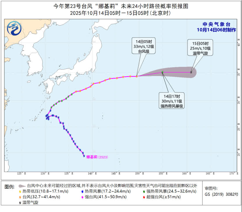 預計,「娜基莉」將以每小時40-45公里的速度向偏東方向快速移動,強度逐漸減弱並變性為溫帶氣旋。未來「娜基莉」對我國無影響。