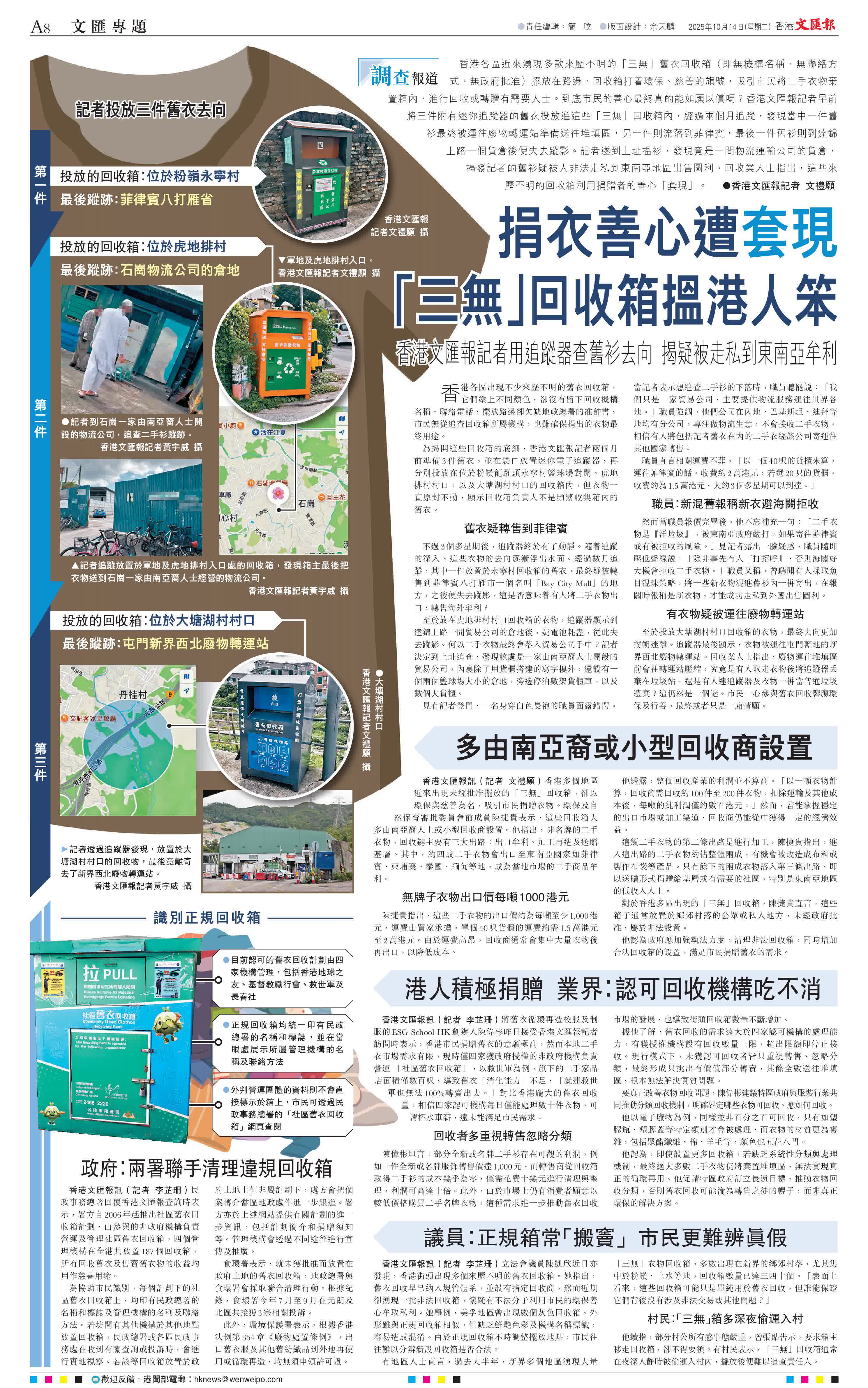 香港多個地區近來出現未經批准擺放的「三無」回收箱,卻以環保與慈善為名,吸引市民捐贈衣物。環保及自然保育審批委員會前成員陳捷貴表示,這些回收箱大多由南亞裔人士或小型回收商設置。他指出,非名牌的二手衣物,回收鏈主要有三大出路:出口牟利、加工再造及送贈基層。其中,約四成二手衣物會出口至東南亞國家如菲律賓、柬埔寨、泰國、緬甸等地,成為當地市場的二手商品牟利。