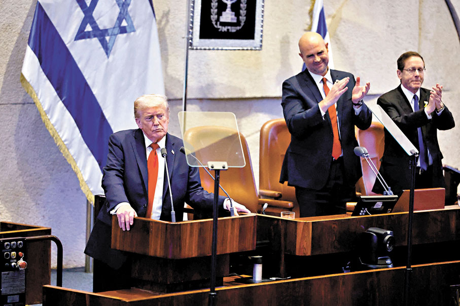 特朗普當日上午抵達以色列,在以國國會發布演說,他宣稱今次協議是新中東的歷史性曙光,宣稱哈馬斯必須卸下武裝。特朗普的演說一度被一名以色列左翼議會議員打斷。以總統赫爾佐格早前稱,他將向特朗普授予以色列最高平民榮譽總統榮譽勳章,表彰特朗普推動哈馬斯釋放以色列人質,感謝其對以色列堅定不移的支持。