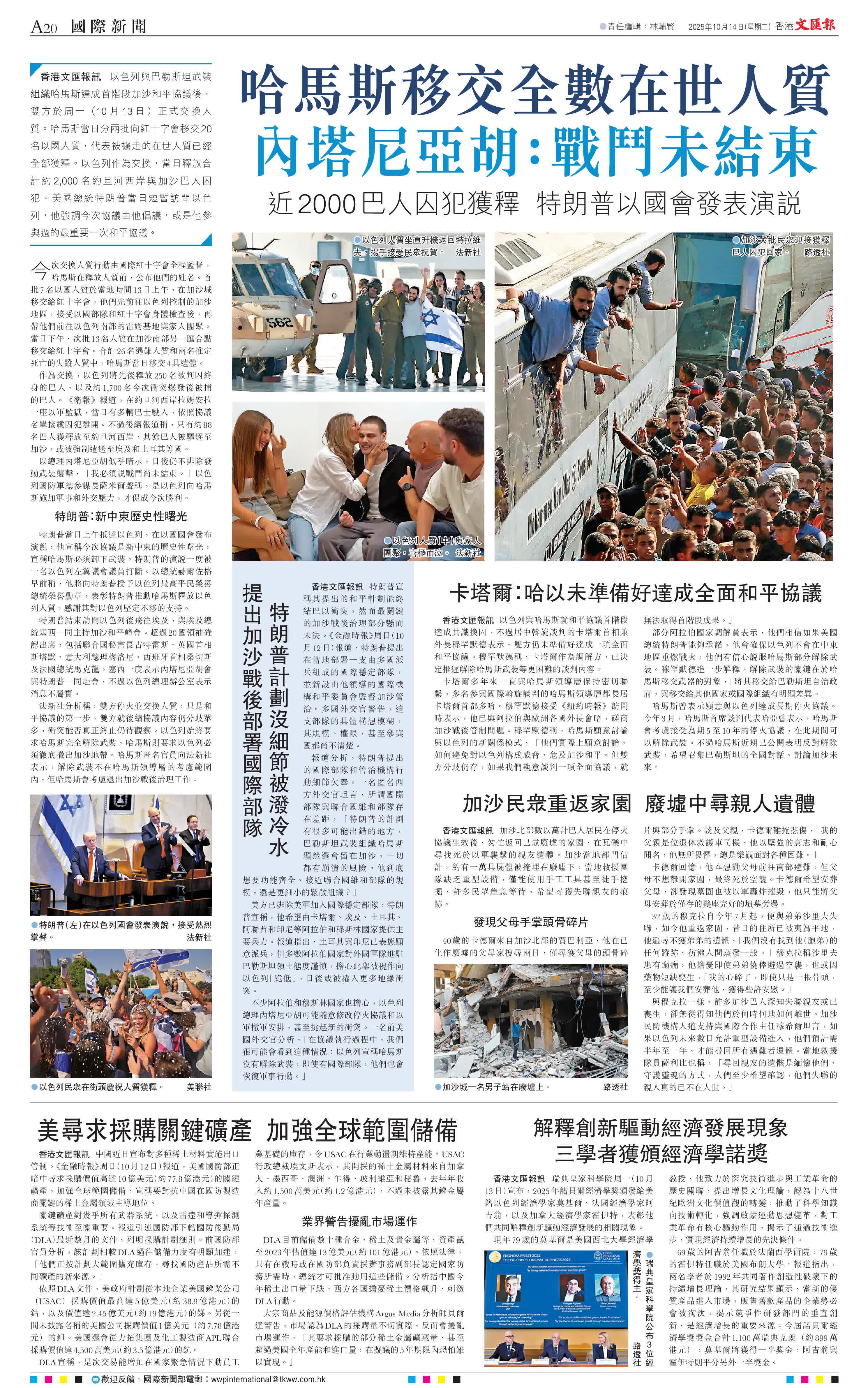 香港文匯報訊 以色列與巴勒斯坦武裝組織哈馬斯達成首階段加沙和平協議後,雙方於周一(10月13日)正式交換人質。哈馬斯當日分兩批向紅十字會移交20名以國人質,代表被擄走的在世人質已經全部獲釋。以色列作為交換,當日釋放合計約2,000名約旦河西岸與加沙巴人囚犯。美國總統特朗普當日短暫訪問以色列,他強調今次協議由他倡議,或是他參與過的最重要一次和平協議。