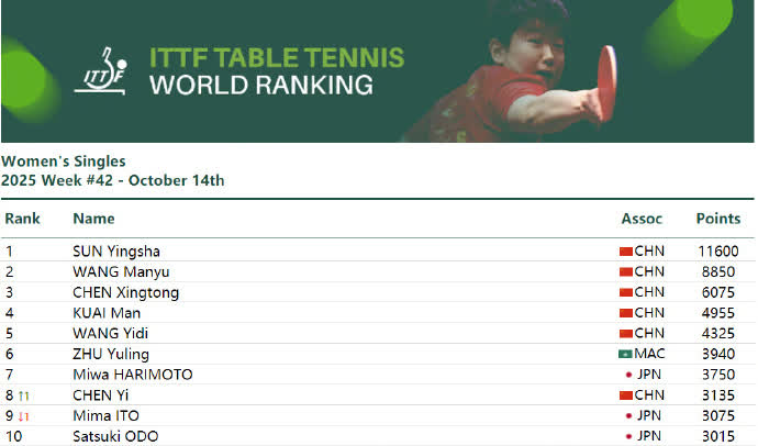 10月14日,國際乒聯更新2025年第42周世界排名:女單方面,孫穎莎11600分連續第170周霸榜第一,王曼昱8850分排名第二,陳幸同6075分排名第三。