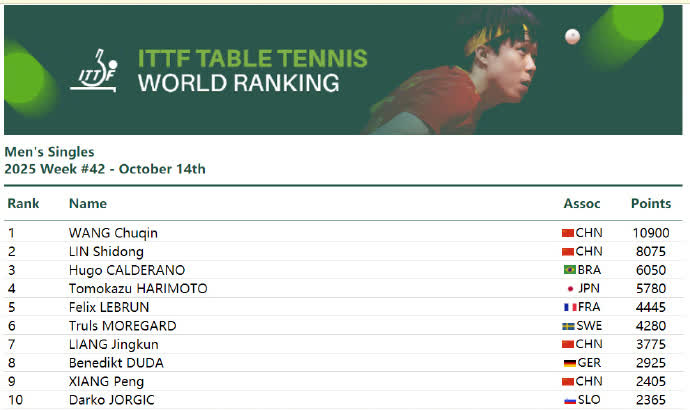 男單方面,王楚欽10900分排名第一,林詩棟8075分排名第二,雨果6050分排名第三。