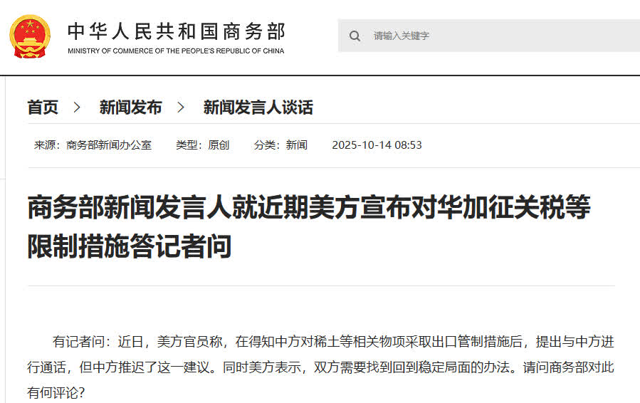有記者問:近日,美方官員稱,在得知中方對稀土等相關物項採取出口管制措施後,提出與中方進行通話,但中方推遲了這一建議。同時美方表示,雙方需要找到回到穩定局面的辦法。請問商務部對此有何評論?
