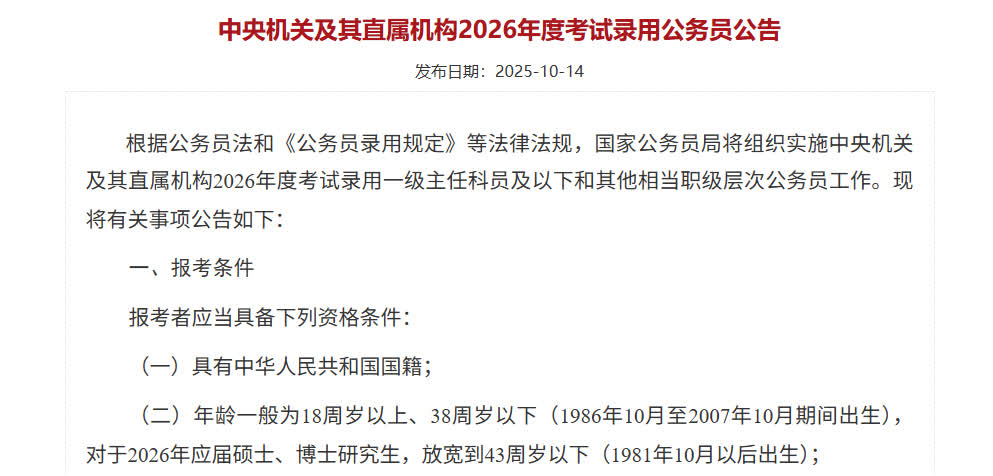 值得注意的是,報考者年齡要求有所放寬,具體為:年齡一般為18周歲以上、38周歲以下(1986年10月至2007年10月期間出生),對於2026年應屆碩士、博士研究生,放寬到43周歲以下(1981年10月以後出生)。